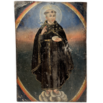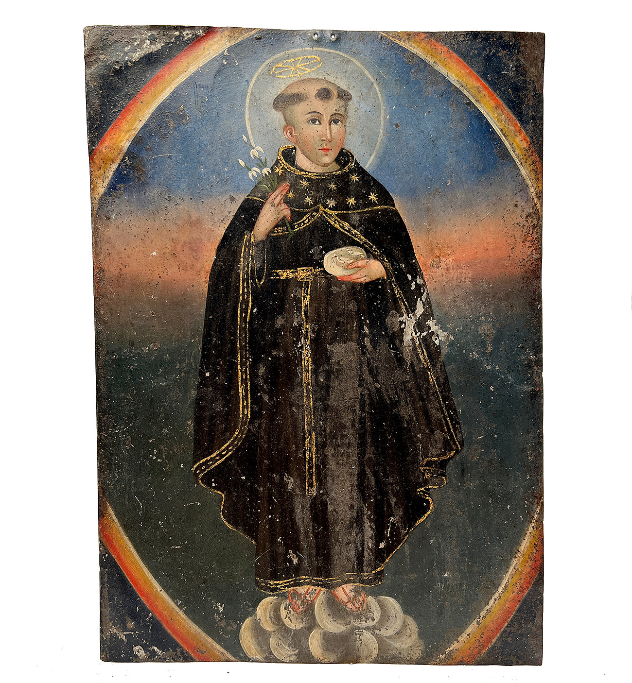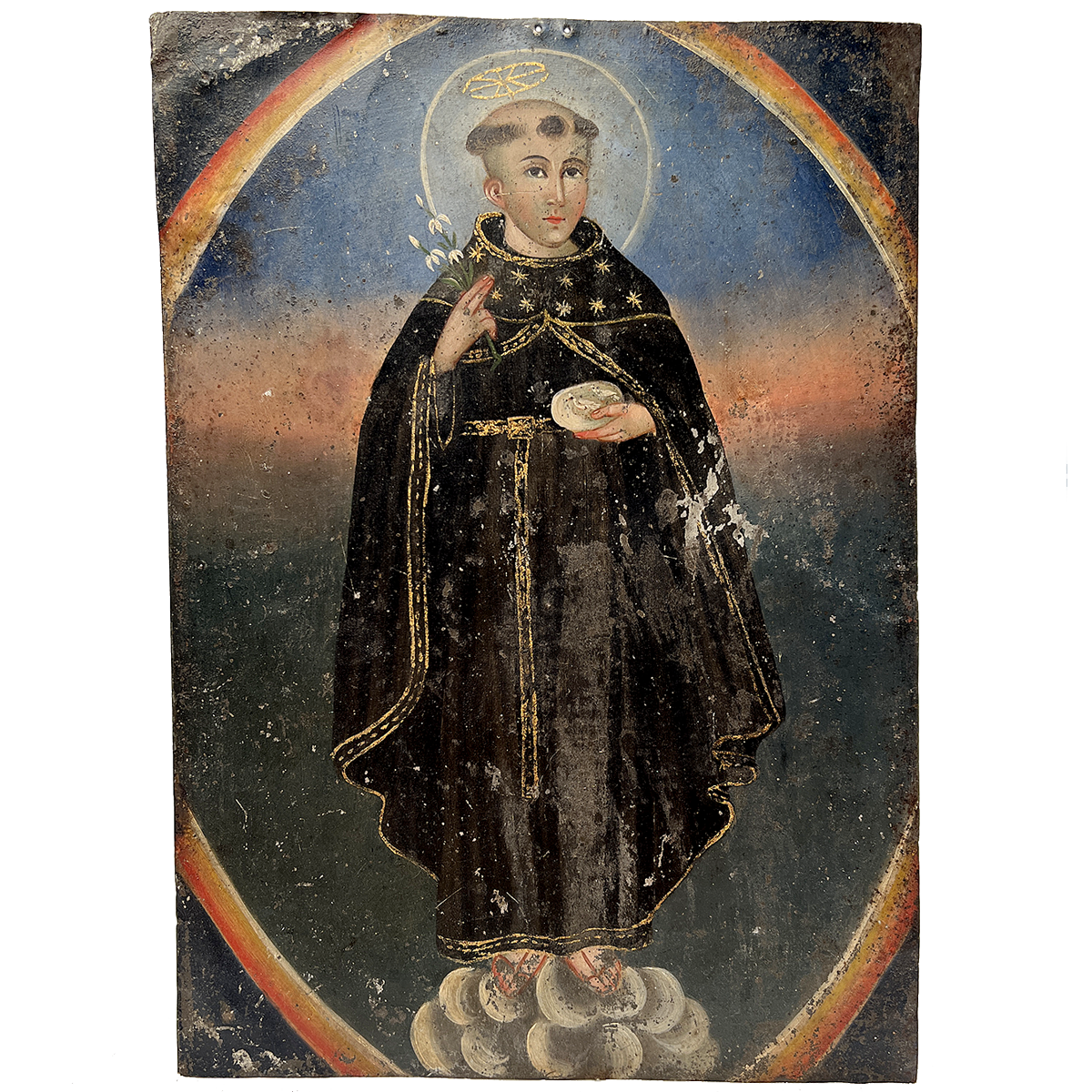 This 19th century Mexican folk retablo represents San Nicolas Tolentino, patron saint of sick animals, babies, mariners and souls in purgatory. According to popular legend, San Nicolas was instructed to eat more meat after falling ill one day so he served himself a partridge. After making the sign of the cross, the bird came to life and flew away. He is almost always shown with a white partridge, his most identifiable attribute.