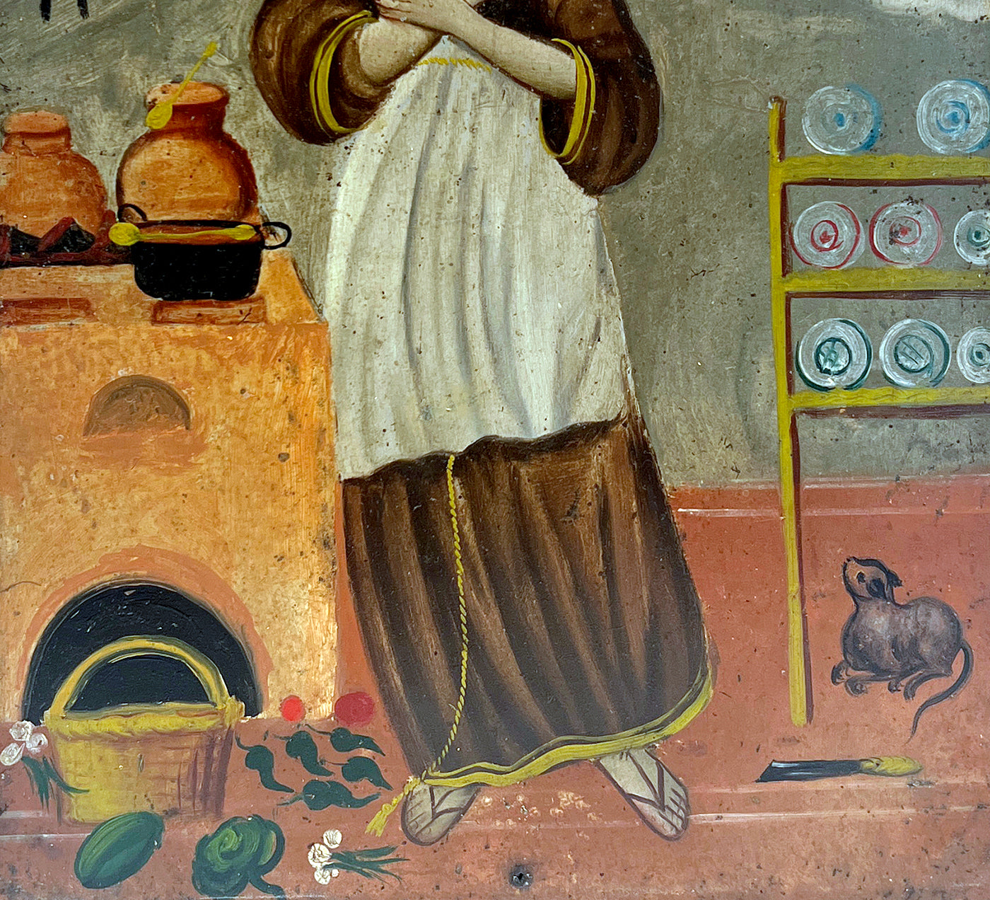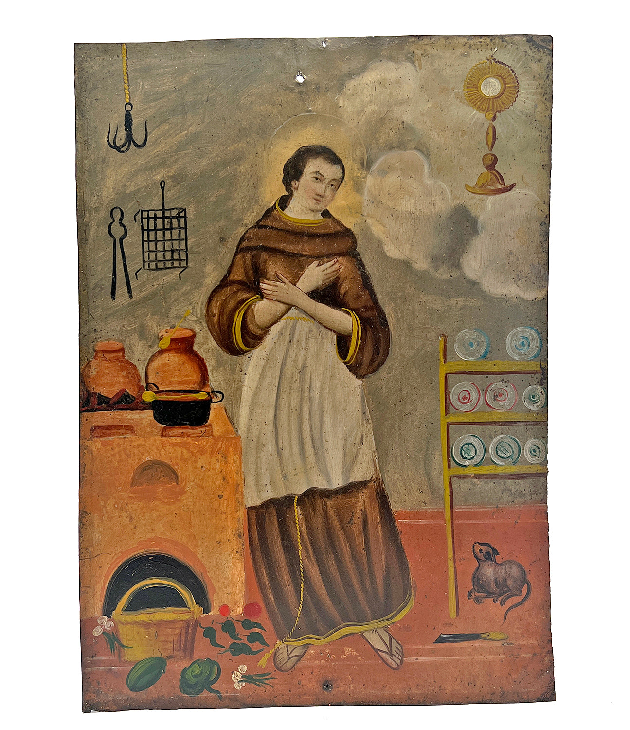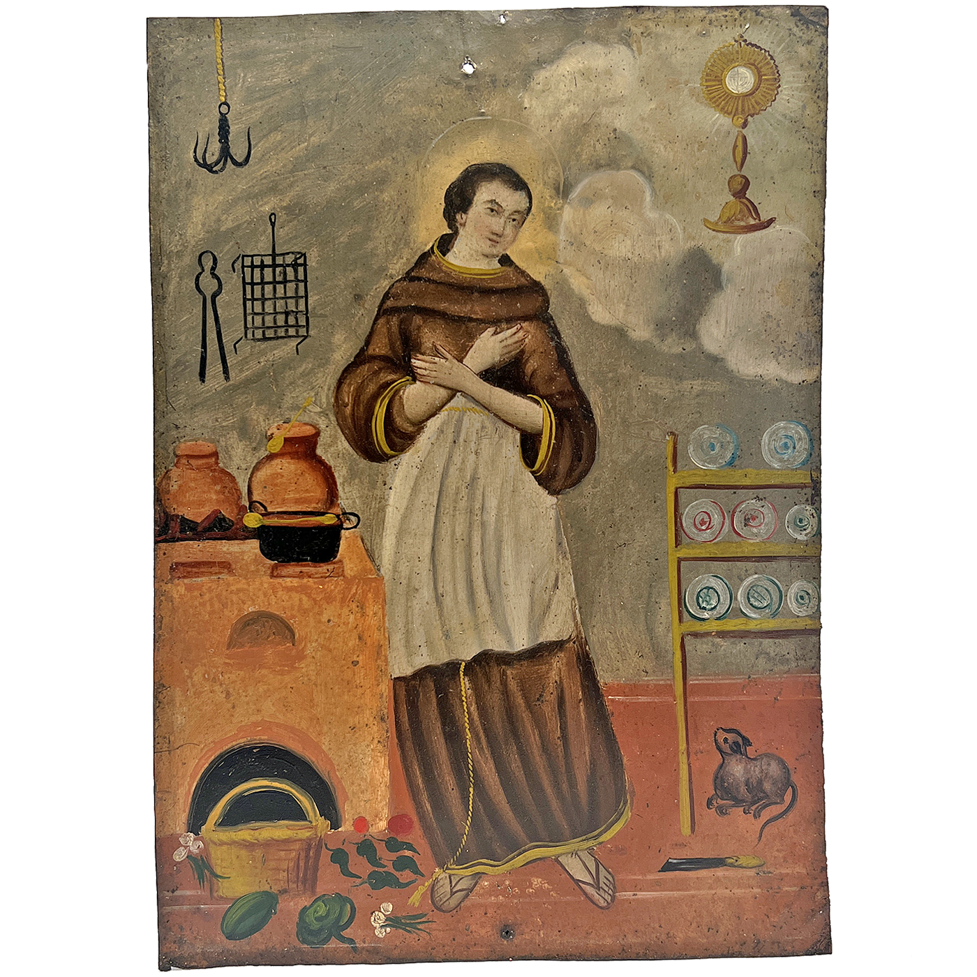 Saint Pascal is the patron saint of cooks and kitchens. He is almost always depicted as he is here, surrounded by cooking paraphernalia, a stove, pots, pans, colorful fruits, vegetables and his kitchen cat. San Pascual is venerated by cooks, and by those seeking a good meal. He is sought to protect against cattle plagues, famine and contagious ills.