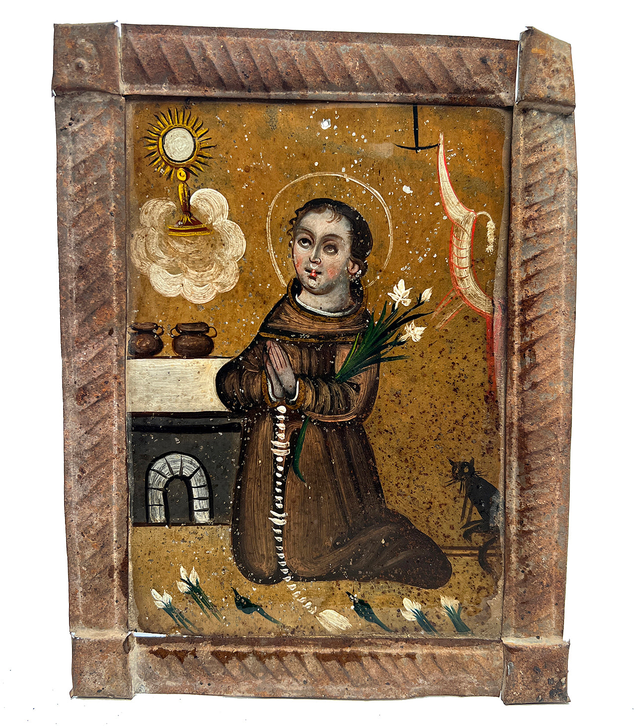 Saint Pascal, the patron saint of cooks and kitchens, is almost always depicted as he is here, surrounded by cooking paraphernalia, a stove, pots, pans, colorful fruits, vegetables and his kitchen cat. San Pascual is venerated by cooks, and by those seeking a good meal. He is sought to protect against cattle plagues, famine and contagious ills.