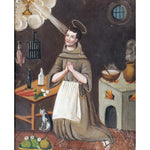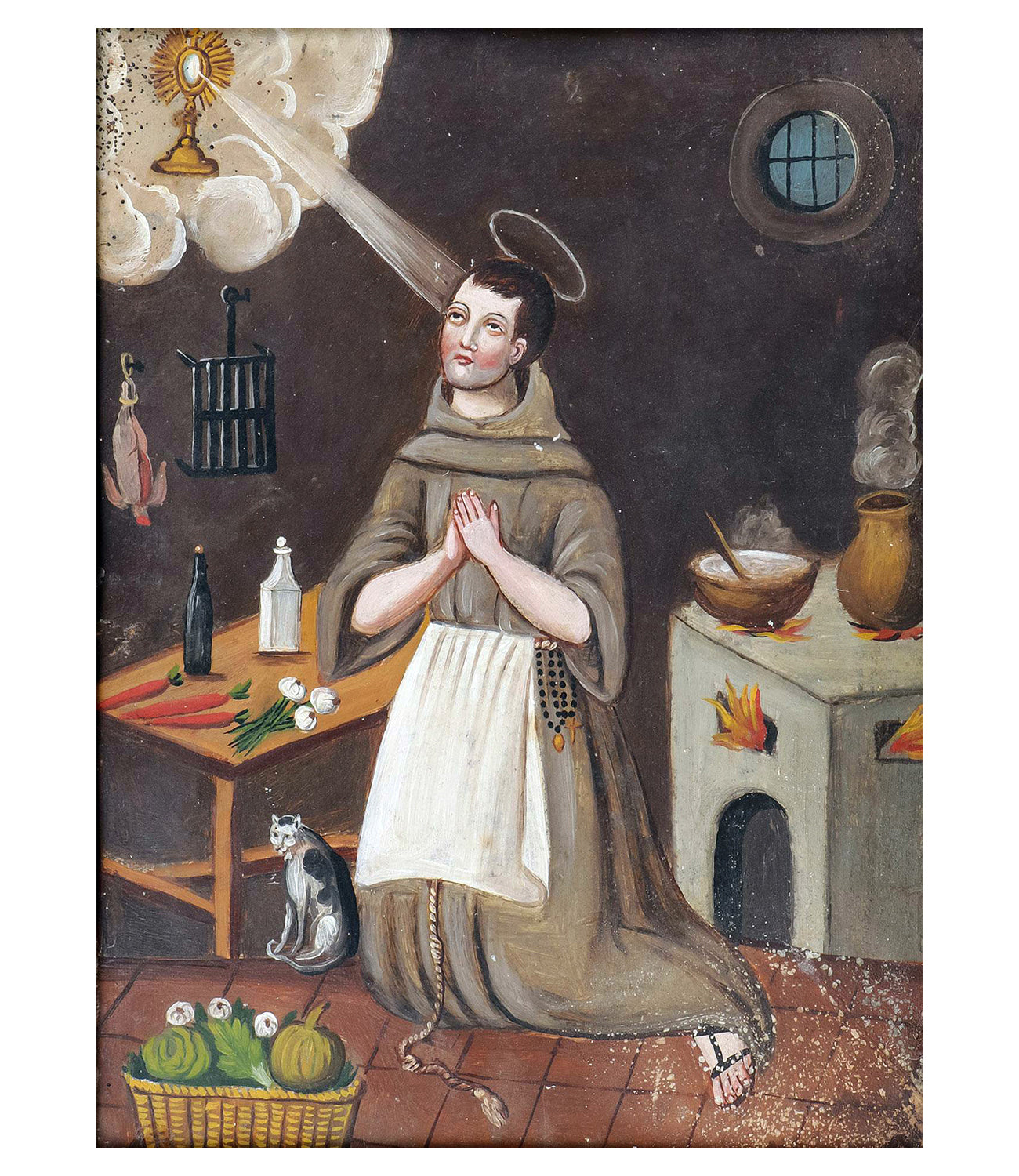 A fine and rare 19th century Mexican folk retablo - San Pascual Bailon, also known as 'The Kitchen Saint'. Saint Pascal is the patron saint of cooks and kitchens. He is almost always depicted as he is here, surrounded by cooking paraphernalia, a stove, pots, pans, colorful fruits, vegetables and his kitchen cat. San Pascual is venerated by cooks, and by those seeking a good meal. He is sought to protect against cattle plagues, famine and contagious ills.