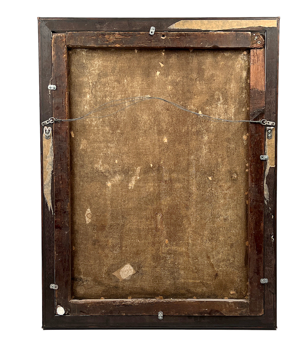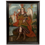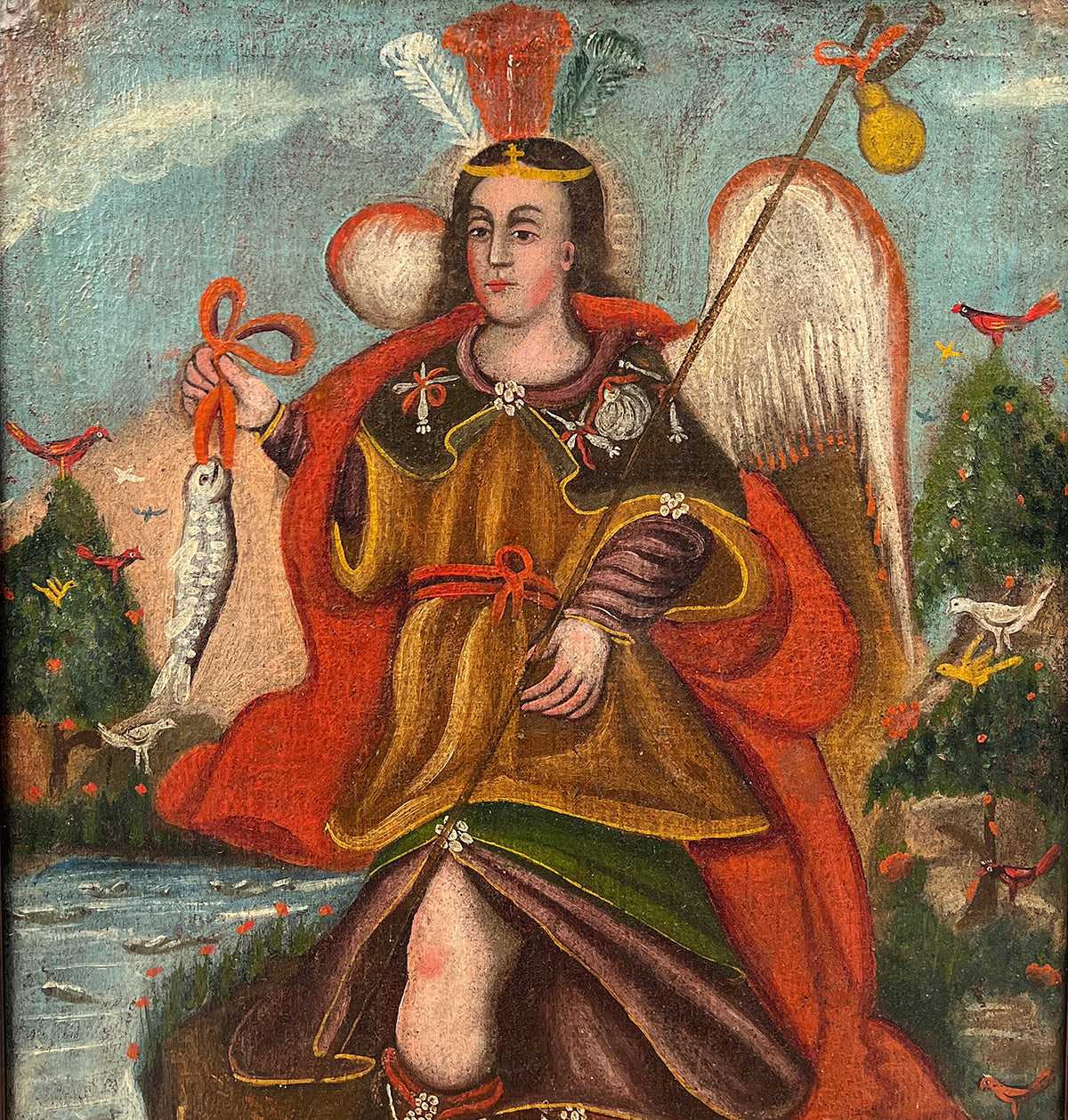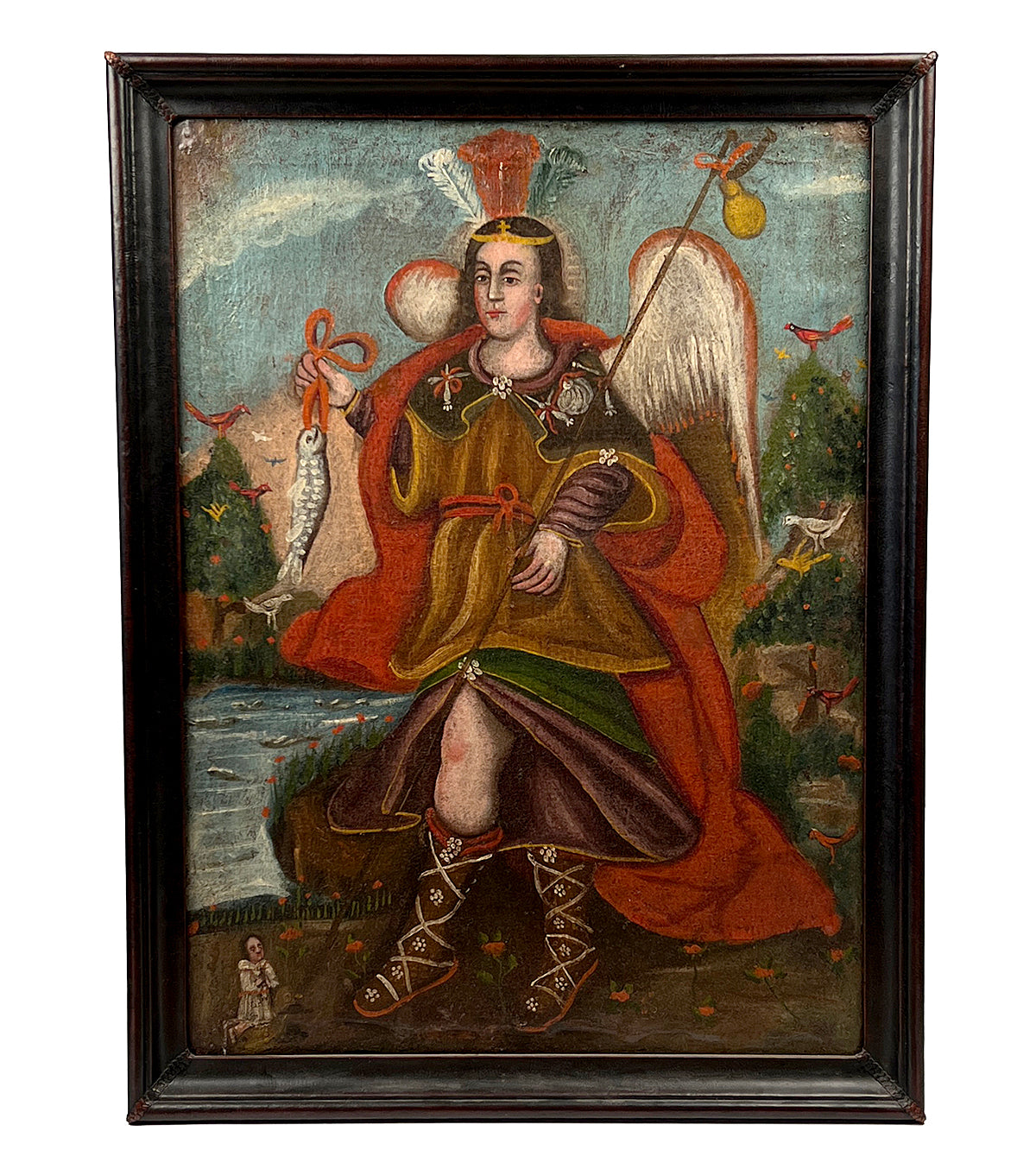 This early to mid 19th century oil on canvas painting represents San Rafael Archangel, patron saint of eye ailments and safe journeys. San Rafael is almost always shown with his gourd, his traveler's staff, his cloak, and a fish, the latter of which he used to cure his father's blindness.