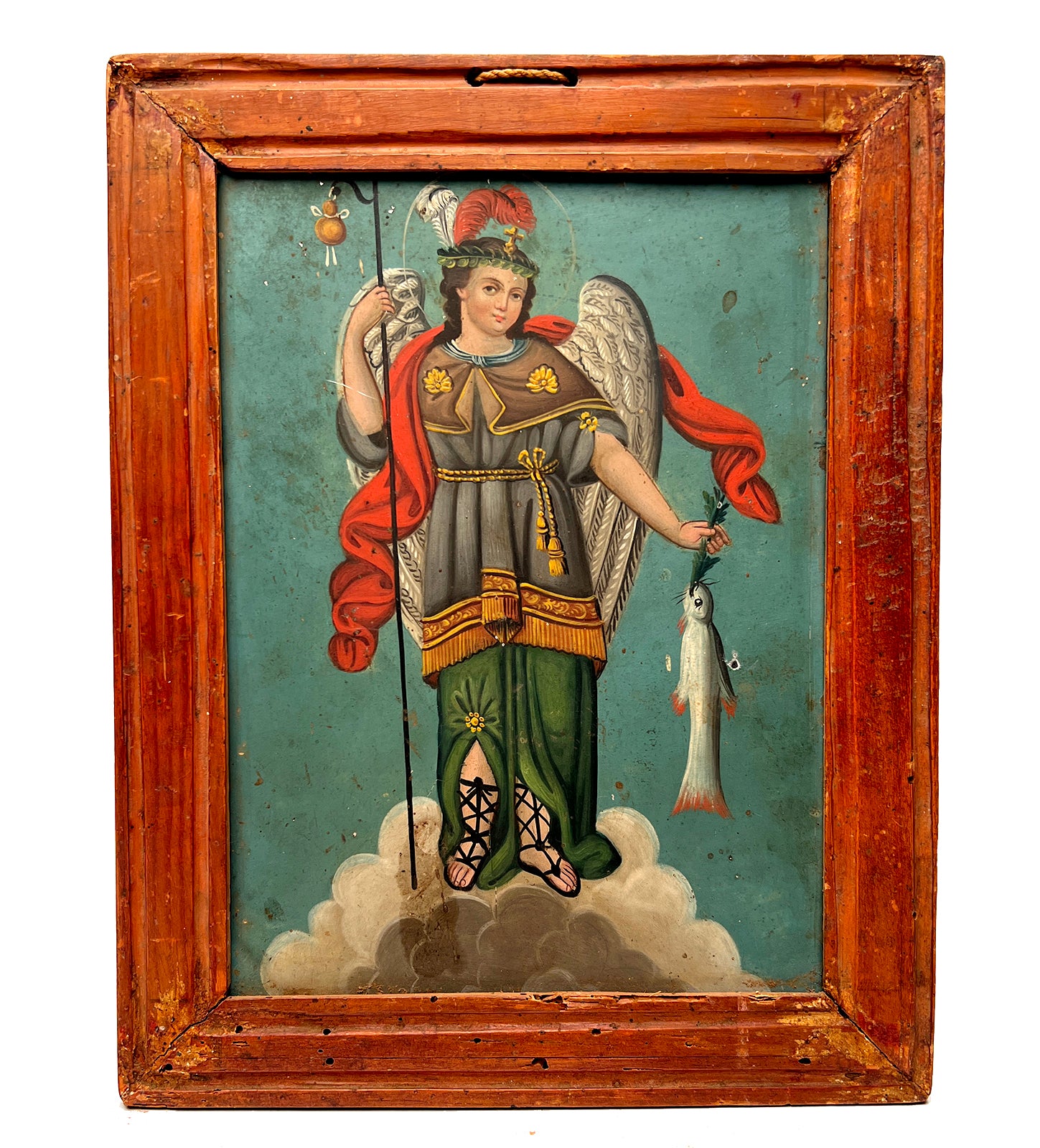 This 19th century retablo painting represents San Rafael Archangel, patron saint of eye ailments and safe journeys. San Rafael is almost always depicted as he is here, with his traveler's staff, his cloak, and a trout, which he used to cure his father's blindness.