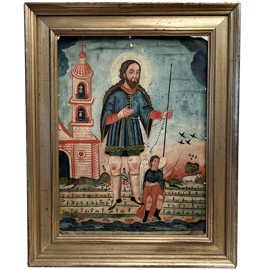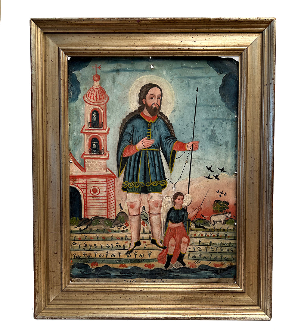 This 19th century retablo represents San Ysidro Labrador, the patron saint of farmers. San Ysidro is invoked for agricultural issues, good weather (before picnics) and prosperous crop. According to popular legend, Saint Isidore was instructed by God to stop working on the Sabbath but the saint was too overwhelmed with work and would not obey. The lord threatened him three times and San Ysidro accepted the Lord's offer of an angel to help him complete his chores. Saint Isidore is almost always depicted as he is here, working the fields with his angel and cattle.