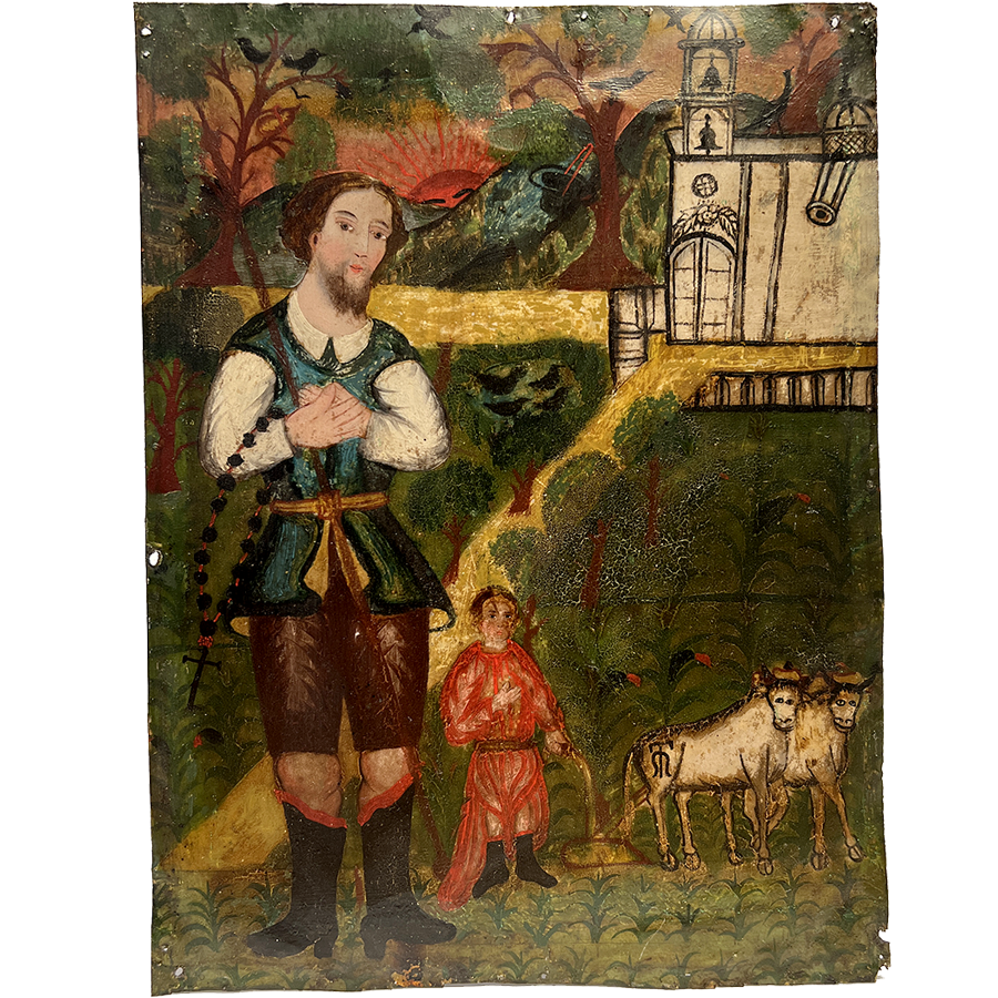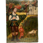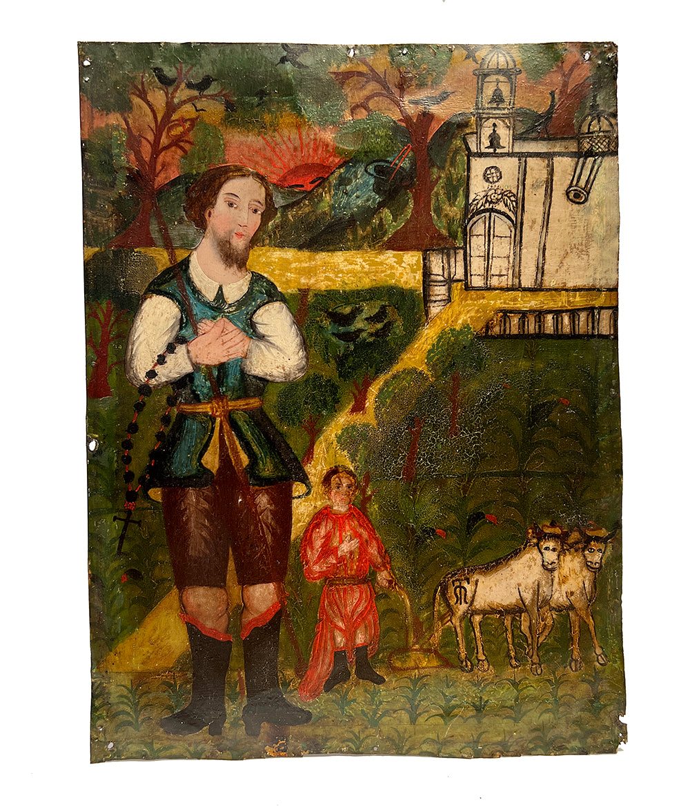 This bright and cheerful 19th century Mexican folk retablo represents San Ysidro Labrador (Saint Isidore Laborer) working the fields with his angel and cattle. Oil on tin. Mexico, circa 1880.