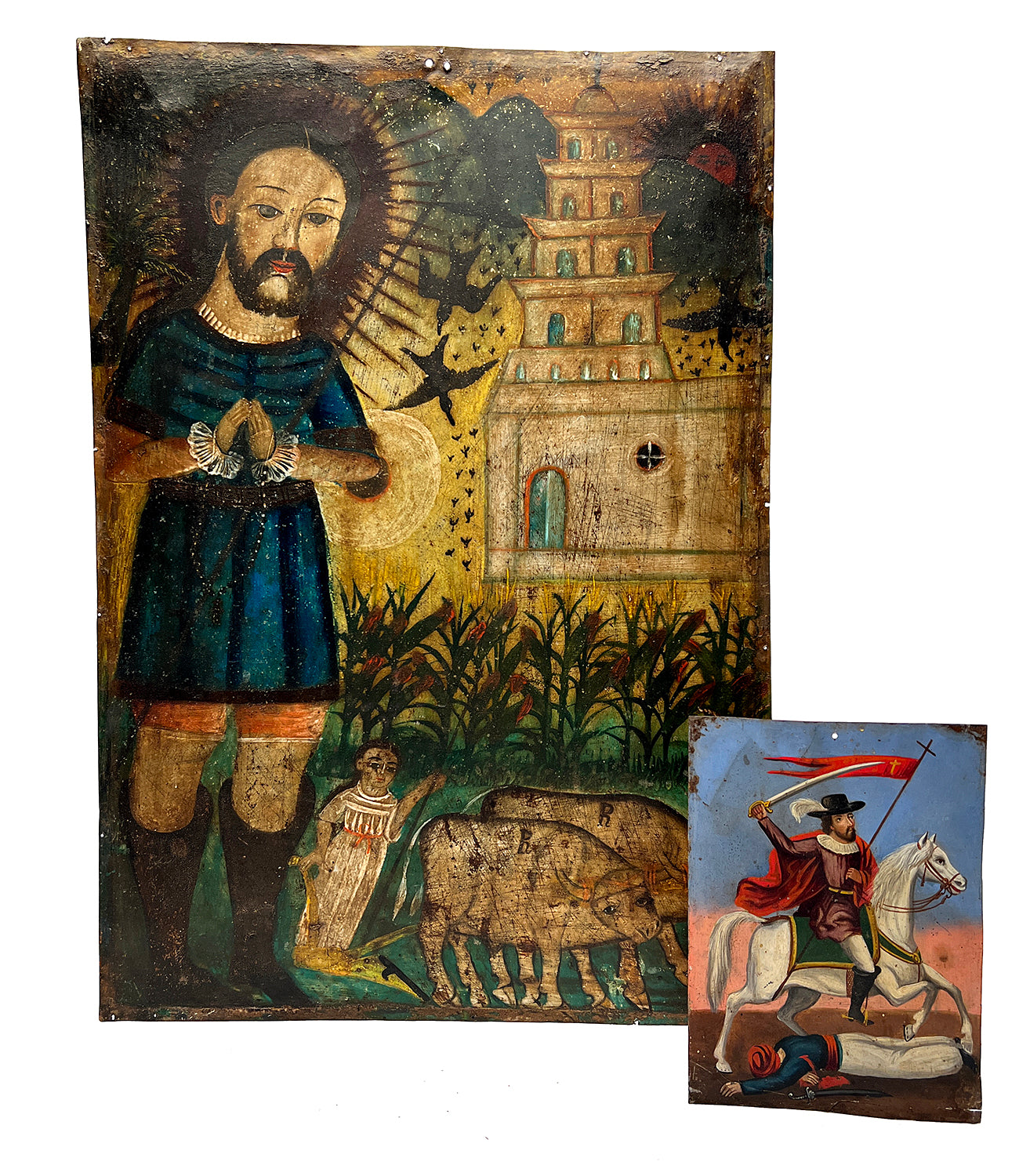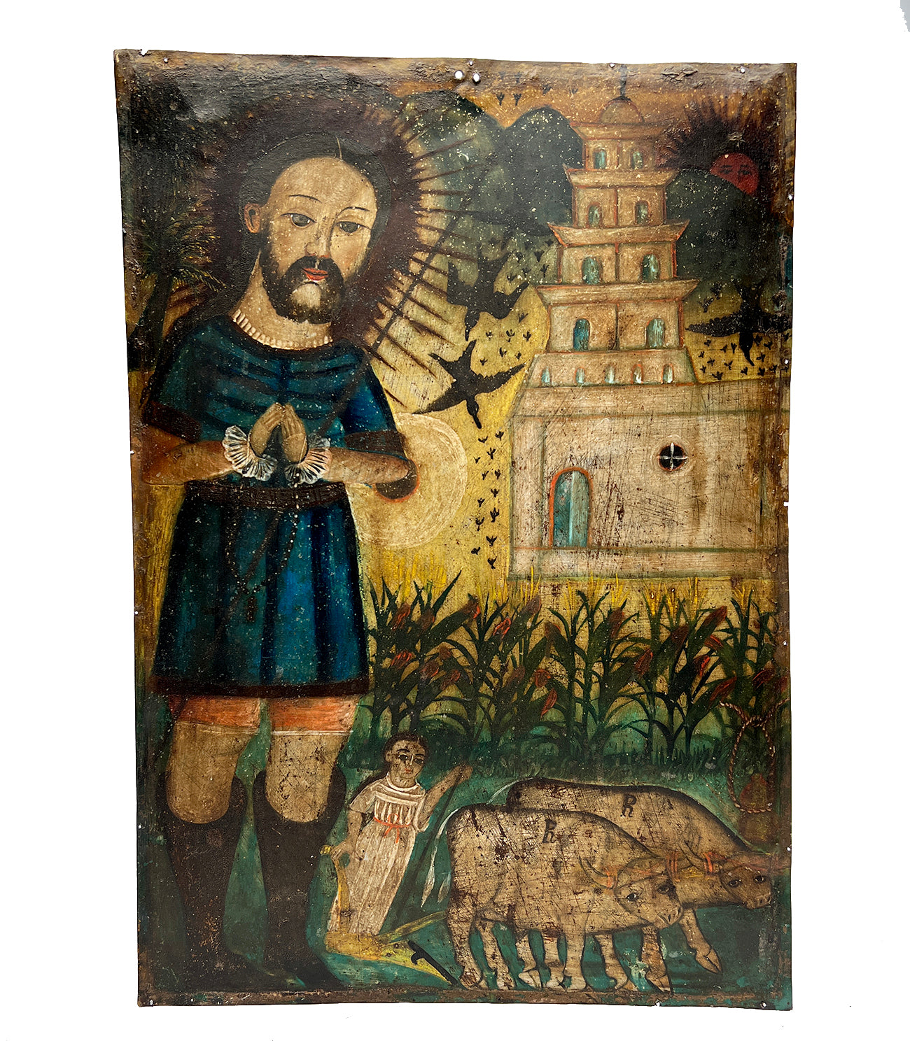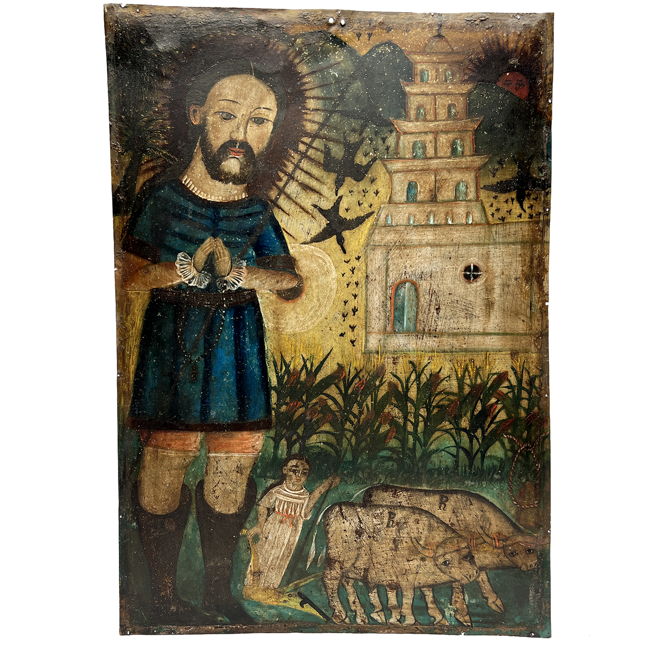 This large and impressive 19th century Mexican folk retablo represents San Ysidro Labrador, the patron Saint of Farmers. San Ysidro Labrador (Saint Isidore the Laborer) is invoked for agricultural issues, good weather (before picnics) and prosperous crop. He is usually shown working the fields together with a diminutive angel and cattle in the foreground.