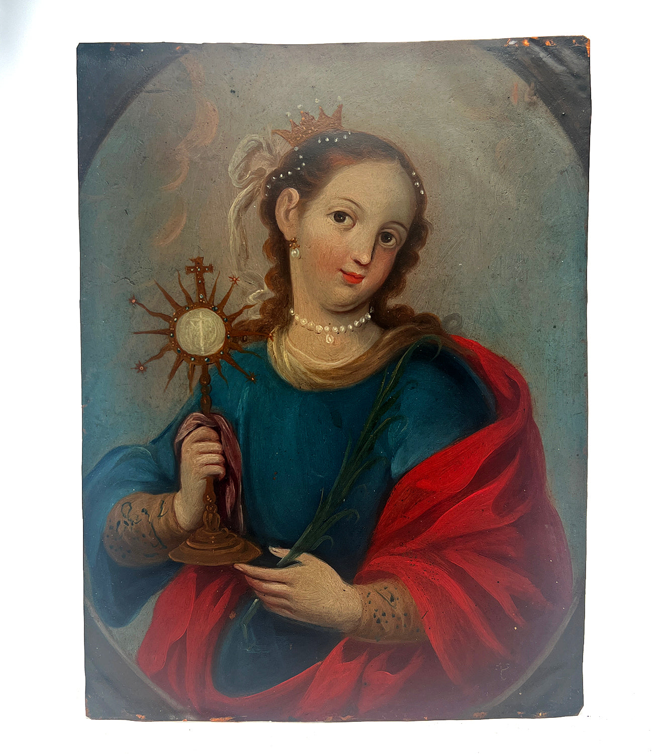 This rare 18th century Spanish colonial oil on heavy gauge copper painting represents Santa Barbara, patroness saint of fire, gunners, masons, miners, storms and for protection against lightening strikes. Santa Barbara was beheaded by her father in 235 A.D. who was in turn, struck by a bolt of fire from heaven. Mexico. Circa 1750.