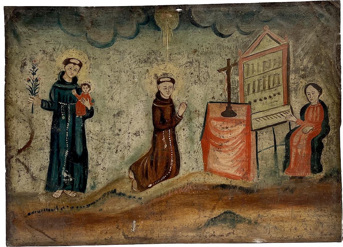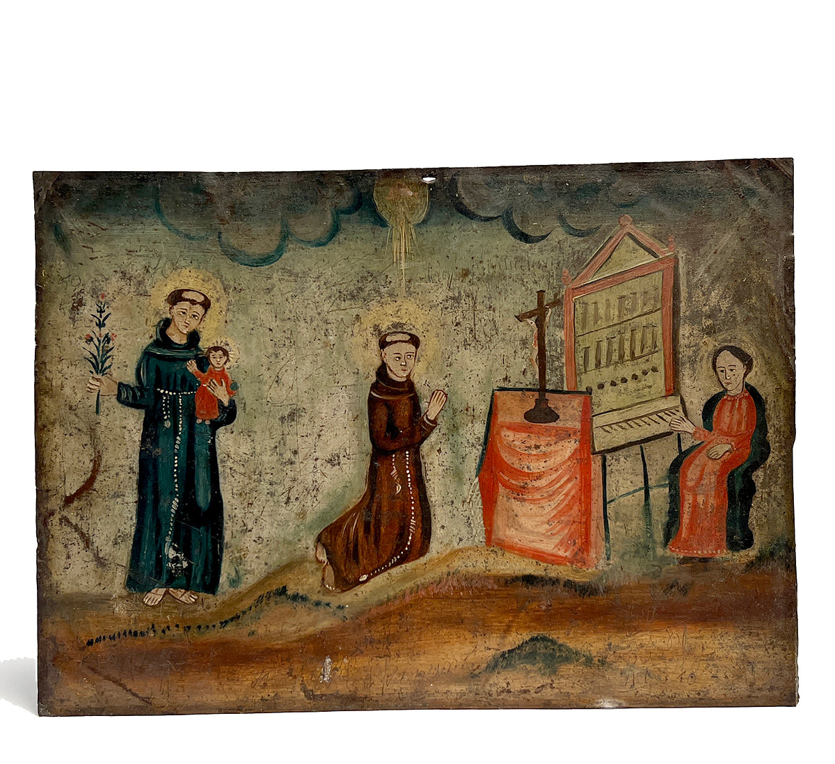 A rare 19th century Mexican folk retablo, Santa Cecilia, the patroness saint of musicians. Oil on tin. Mexico, circa 1880.