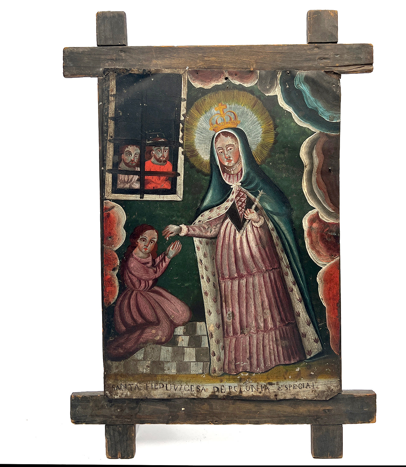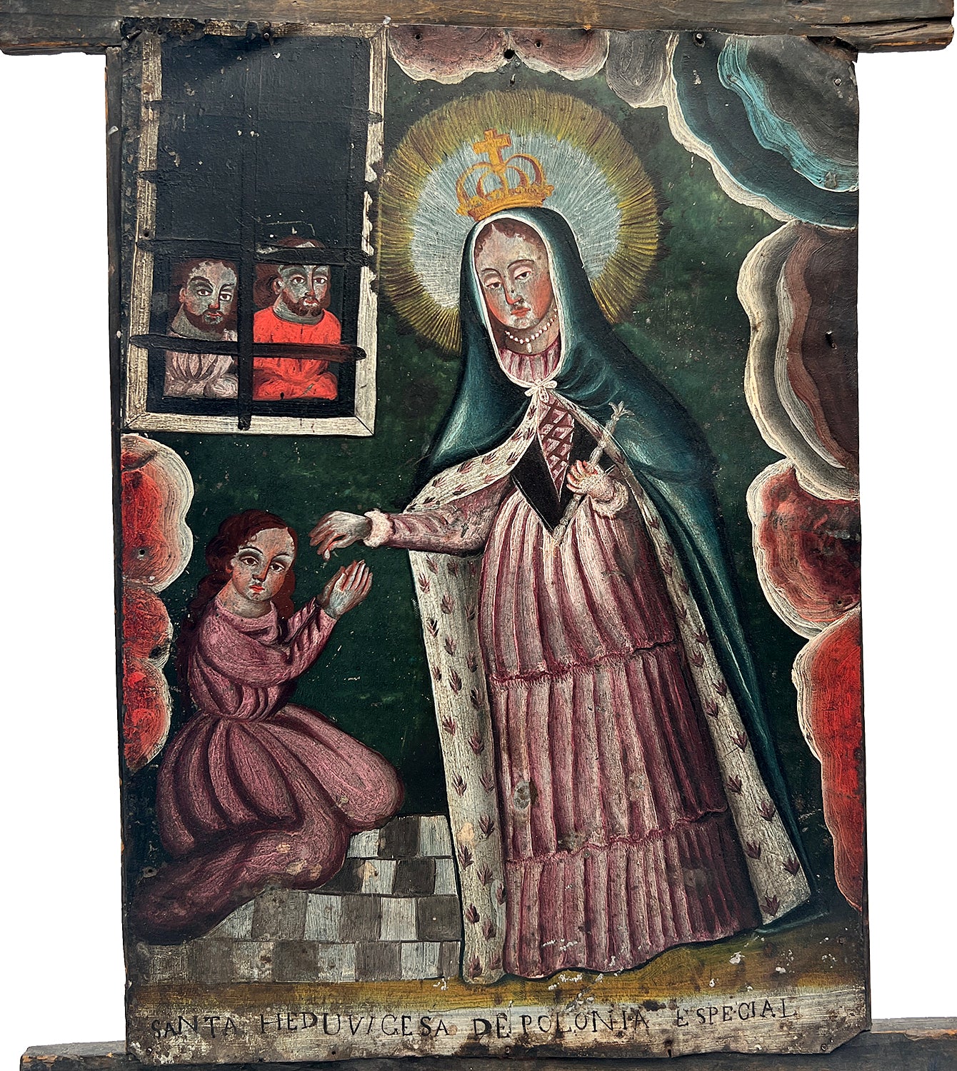 A 19th century oil on tin folk retablo from Mexico. Circa 1880. Santa Eduviges (Saint Hedwig) is the patroness saint Bavaria, brides, jealousy and difficult marriages. She was known mostly for her generosity, bestowing all that she could give to the sick, the feeble, the impoverished and the imprisoned.