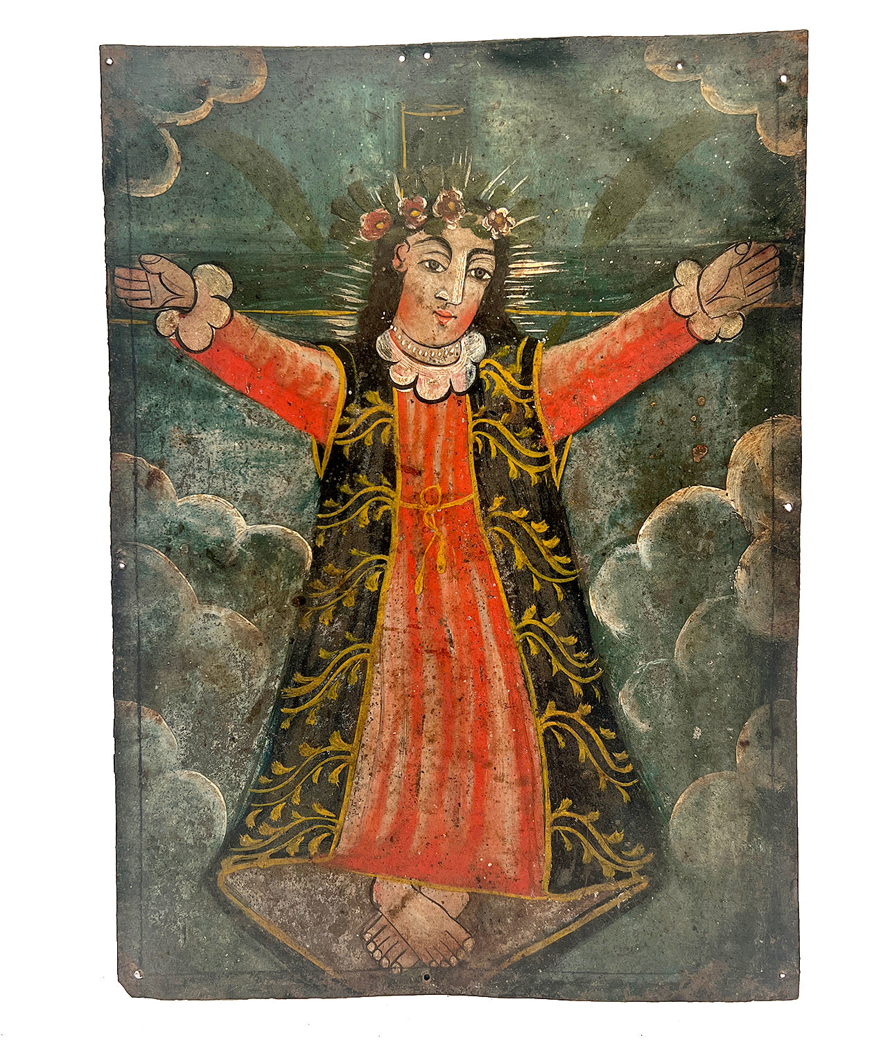 This rare 19th century Mexican retablo represents Santa Librata. Santa Librata is invoked by married women seeking liberation from difficult husbands and those suffering at the hour of death. According to legend, her father (King of Lusitania) had arranged her marriage with the King of Sicily. To prevent the unwanted marriage, Santa Librata prayed to be liberated and took a private vow of celibacy. The following day she sprouted a beard, her suitor departed and her father had her crucified. Santa Librata is always depicted as she is here, as a crucified martyr with a large and colorful flower garland.