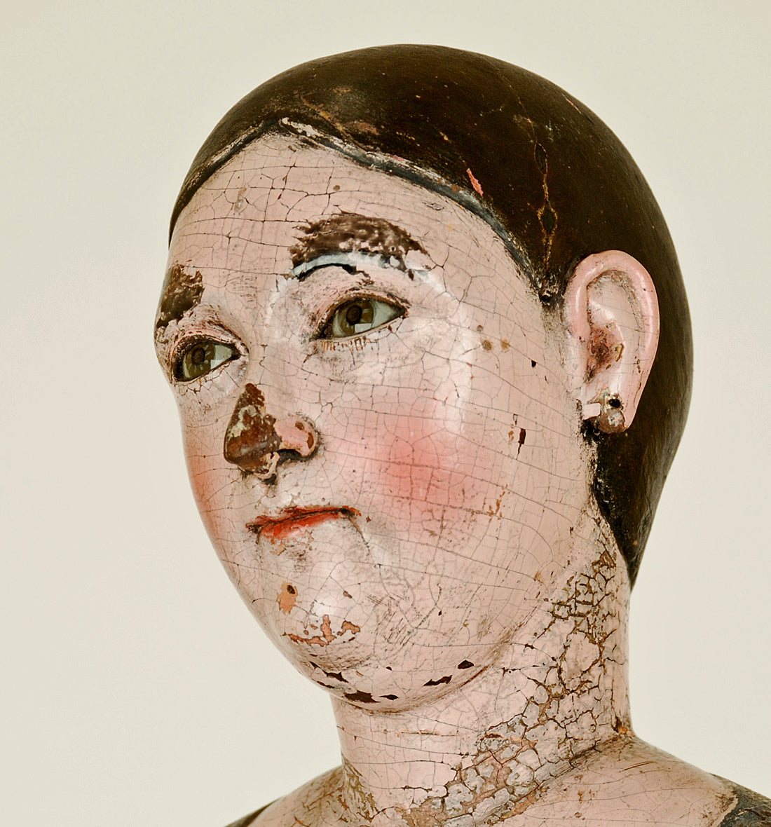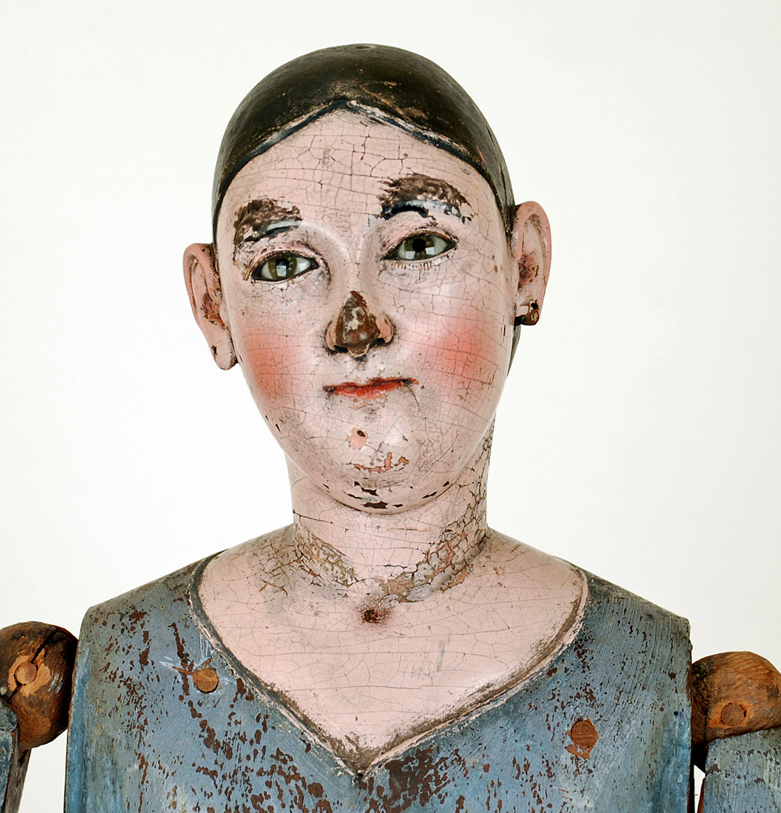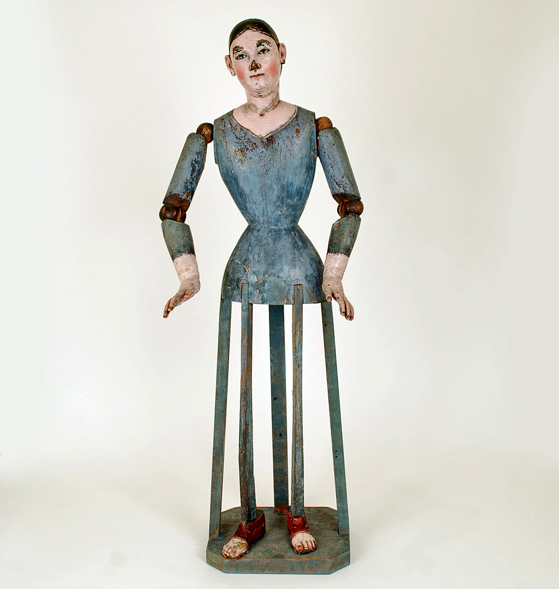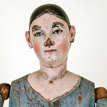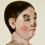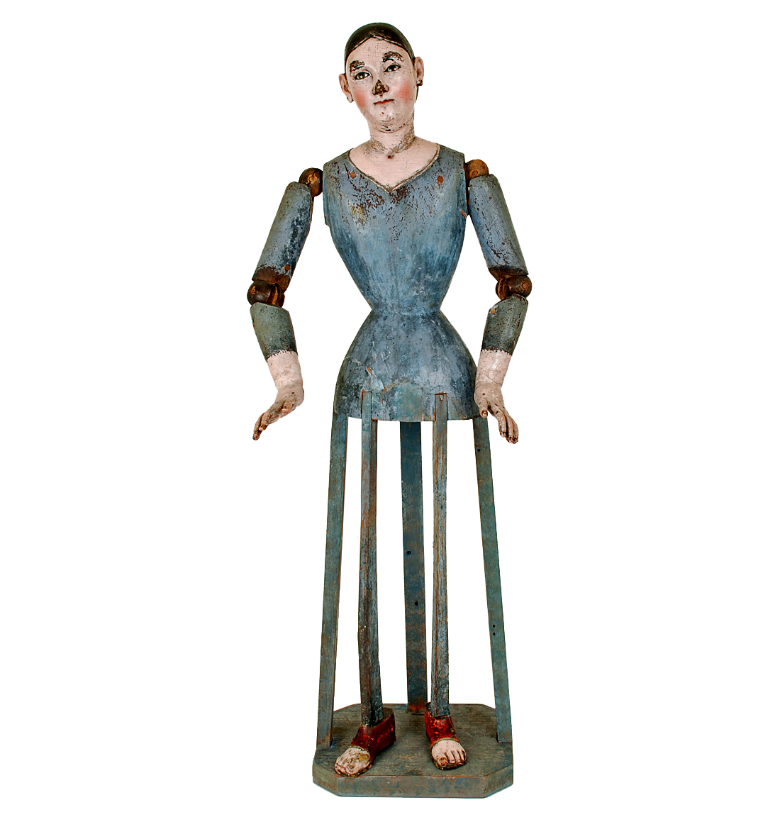 Santa Maria. A 19th century bastidor raised on a slatted cage base. Carved and polychrome painted wood with articulated joints and inset glass eyes. Guatemala. Circa 1850.