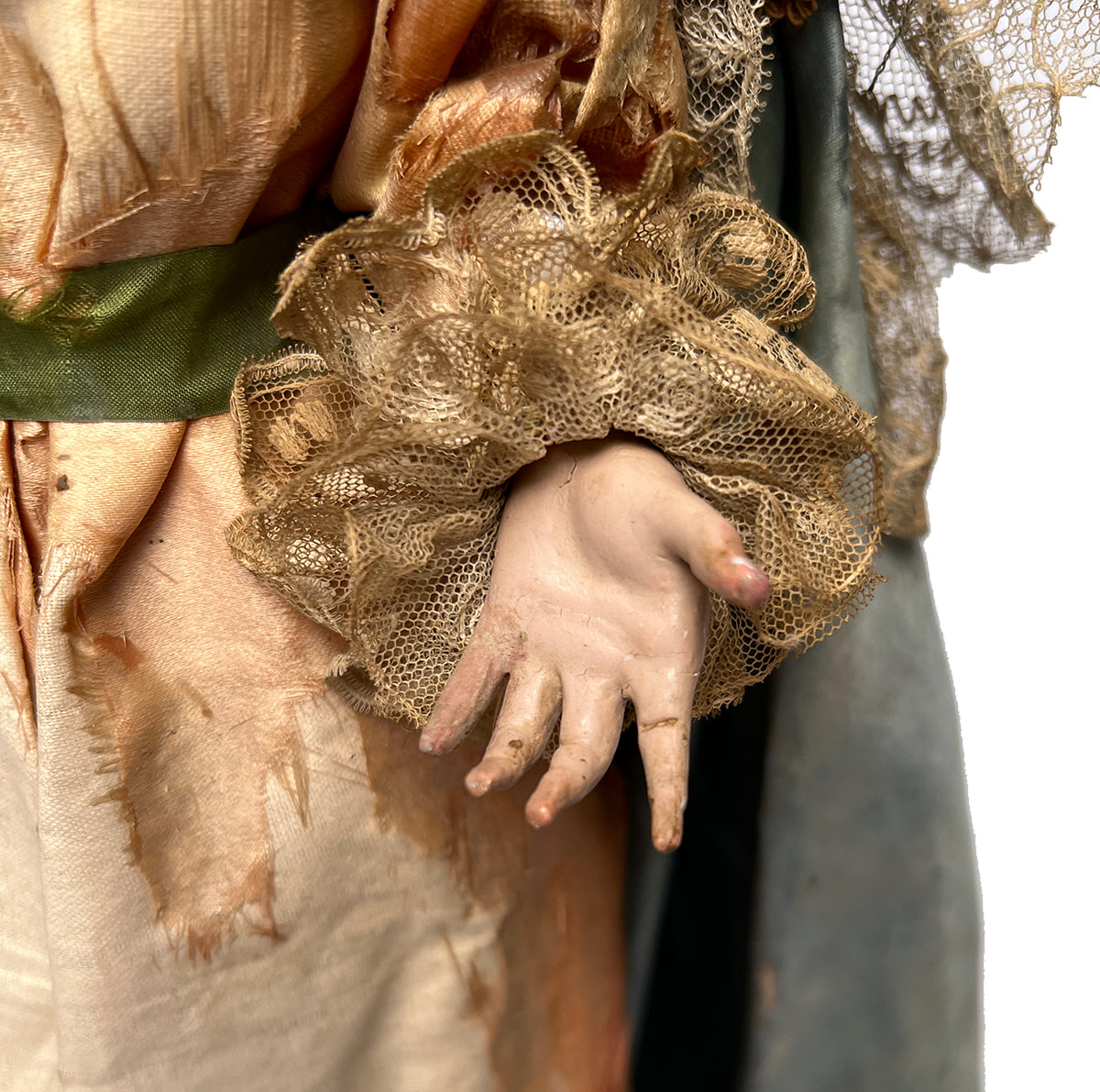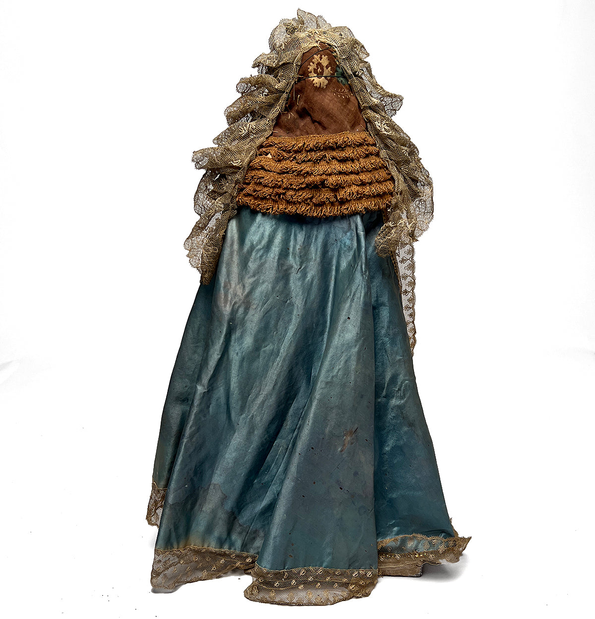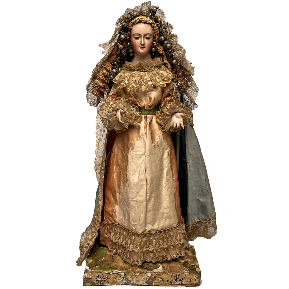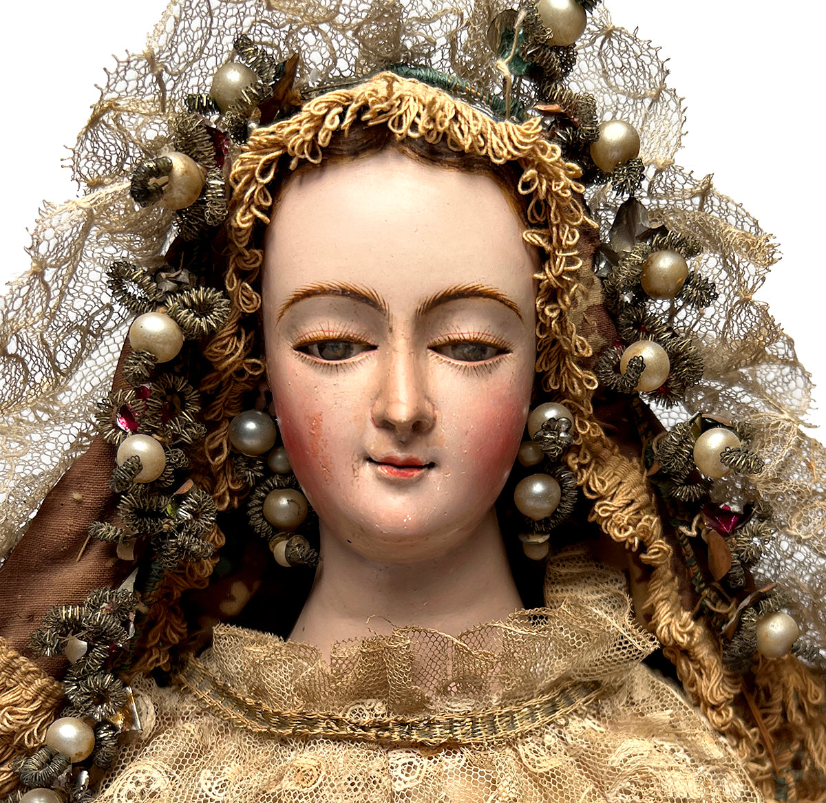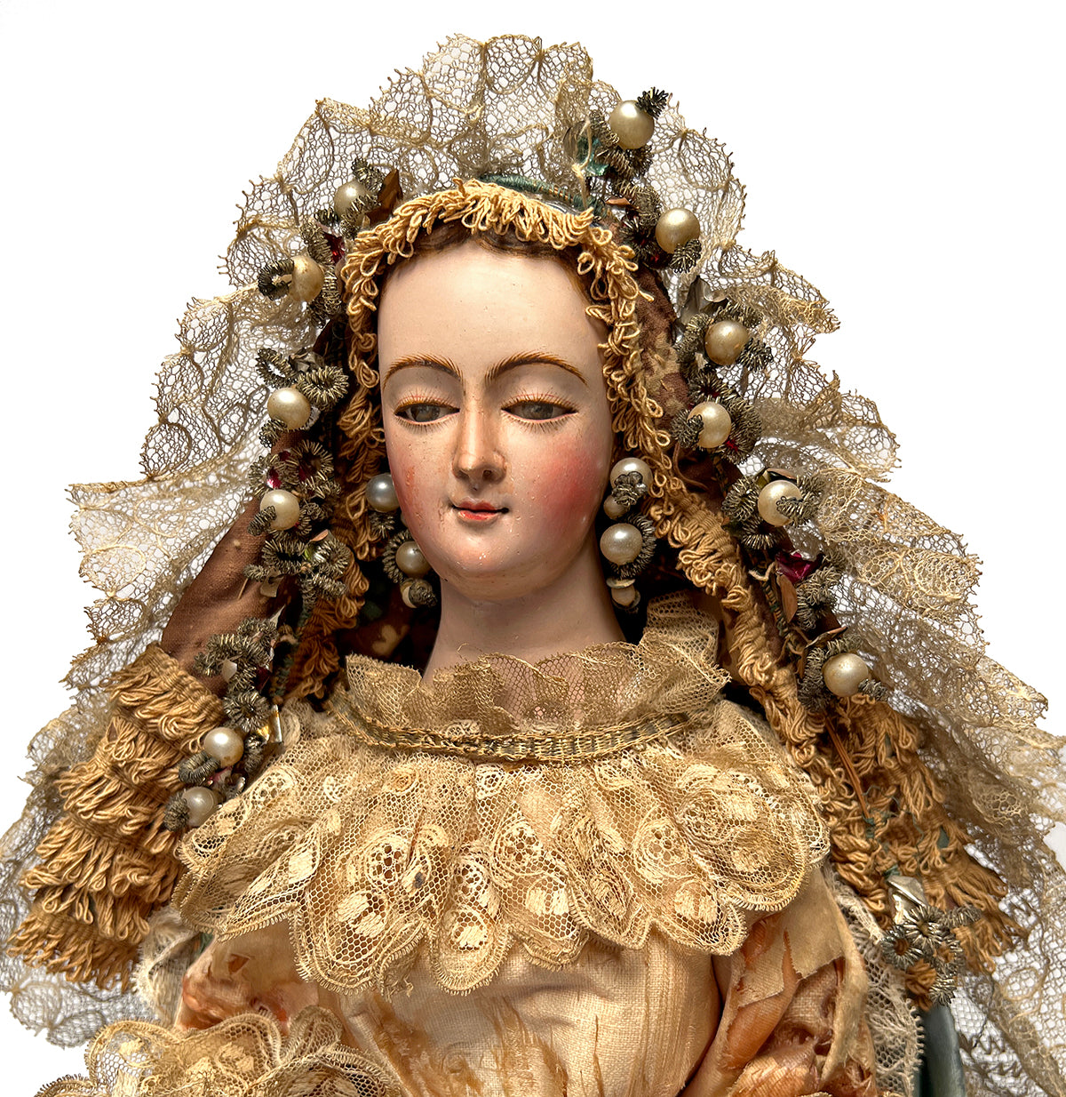Original 18th century hand carved and polychrome painted Santa Maria Santo with original silk garments, macrame fringe and natural pearls.