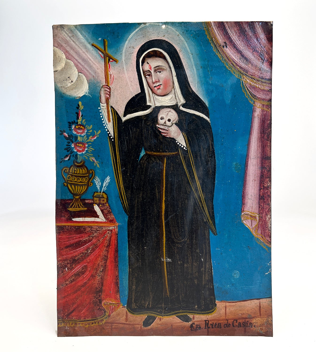 A 19th century Mexican folk retablo. Santa Rita de Santa Rita de Casia, patroness saint of impossible causes, is almost always depicted as she is here, with a spot of blood and a thorn deeply imbedded in her forehead. According to popular legend, in the year of 1441, during a sermon on the crown of thorns, Santa Rita prayed so intently that a thorn detached itself from her crucifix and lodged itself in her forehead. Her wound became so offensive that she spent the better part of her life in total isolation.