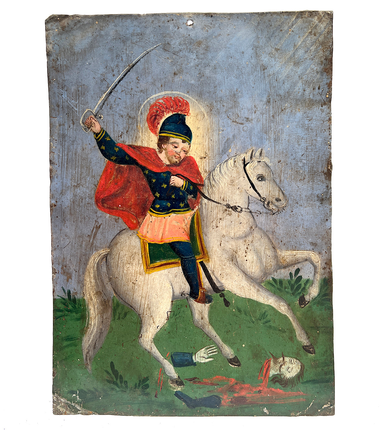 This rare 19th century folk retablo represents Santiago Matamoro / St. James, Moor Slayer. St. James is considered the patron saint of Spain, and his shrine at Santiago de Compostela in Galicia is a major pilgrimage site. He is also the patron saint of pilgrims, soldiers, veterinarians, pharmacists, and people with arthritis.