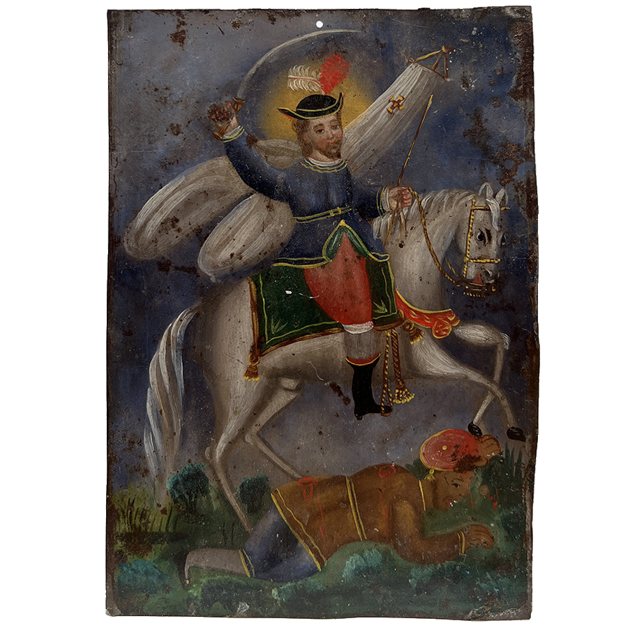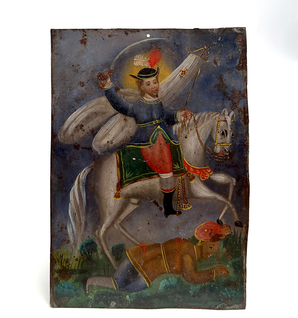 This rare 19th century folk retablo represents "Santiago Matamoro / St. James, Moor Slayer. Oil on tin. Mexico. Circa 1880.
