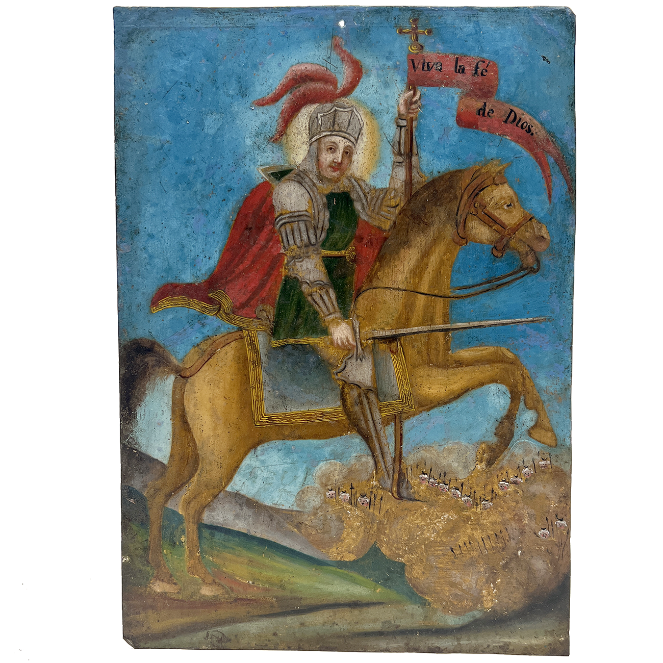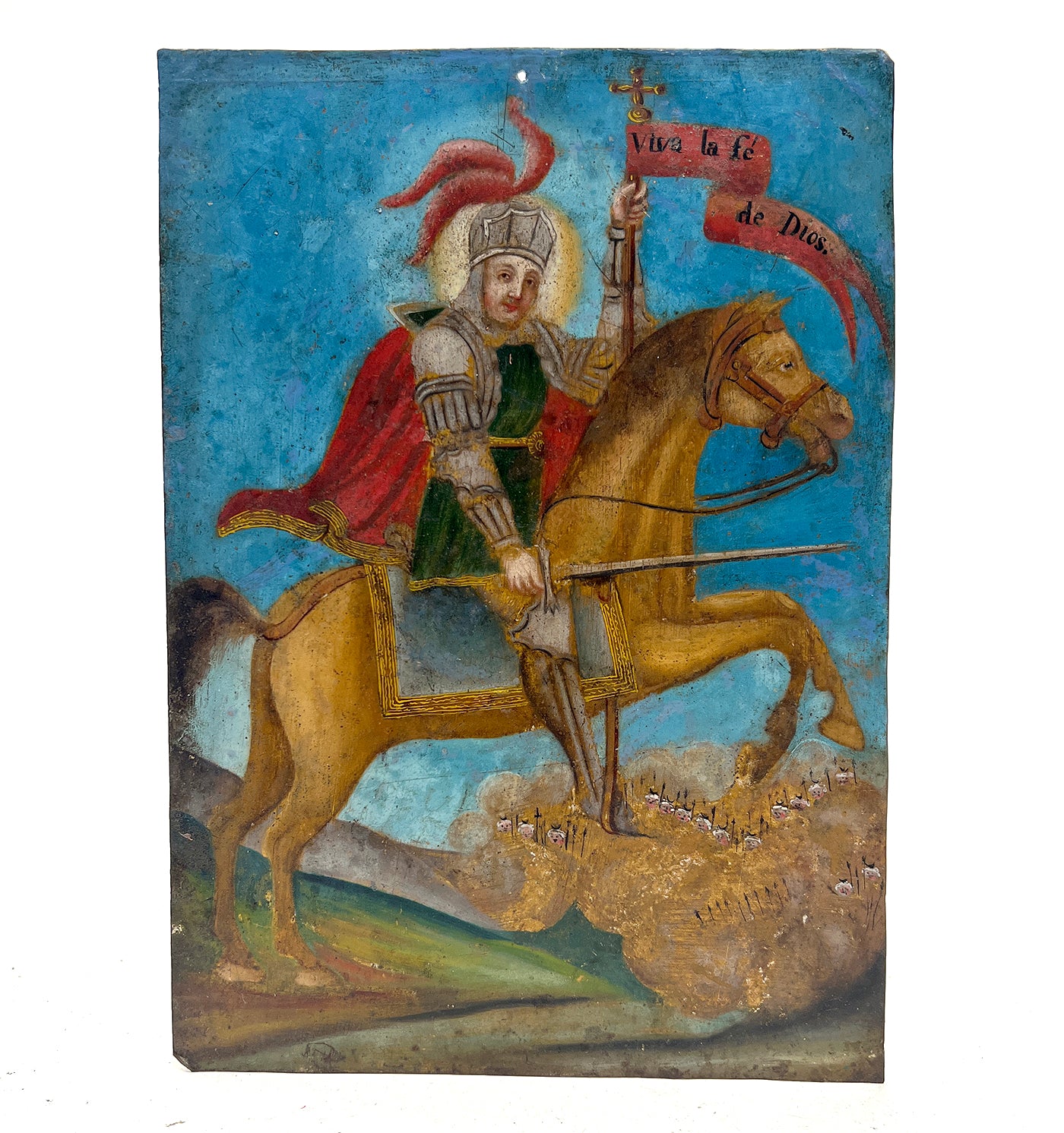 This rare 19th century folk retablo represents "Santiago Matamoro / St. James, Moor Slayer. Oil on tin. Mexico. Circa 1880.