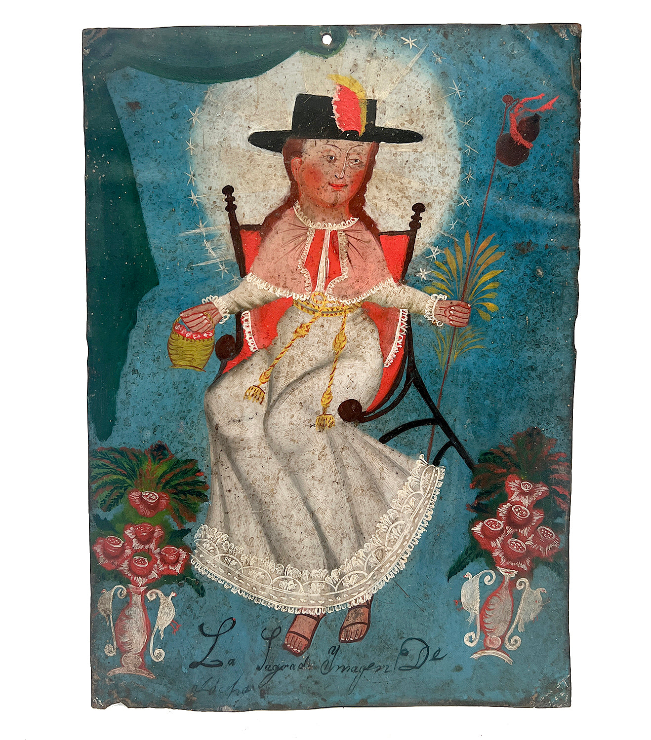 This charming 19th century Mexican folk retablo represents the Santo Nino de Atocha, the patron saint for freeing prisoner. He is also petitioned to perform miracles for travelers and those in danger. This popular image originated in Spain after the Moors invaded the town of Atocha. According to popular legend, there was a prison filled with Christians who lacked basic necessities including food and water. Only missionary children were allowed to visit and one day after family members prayed a child carrying a basket, a staff and a gourd of water, came dressed as a pilgrim. After he served everyone in the prison both his basket and gourd were still full. It was then believed that the miraculous visitation was none other than the infant Jesus.