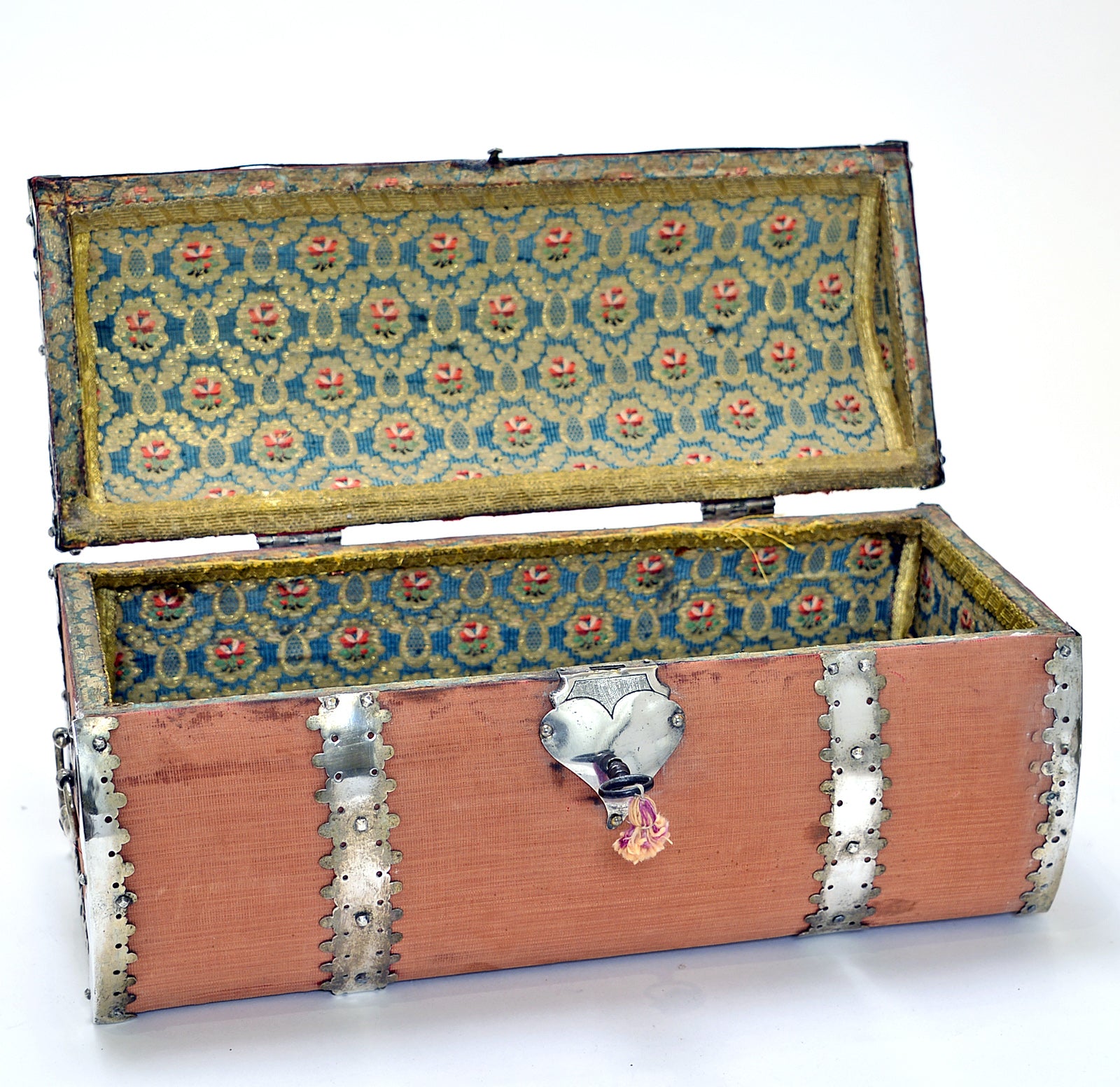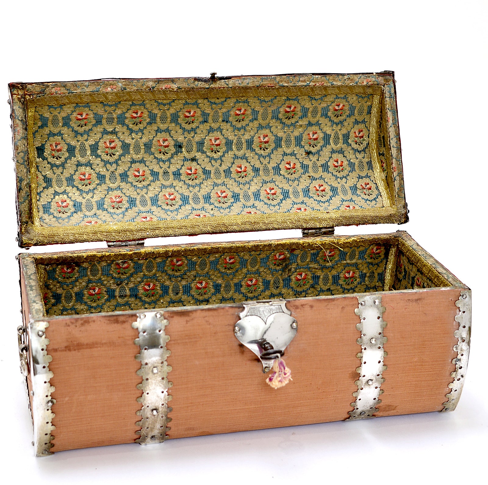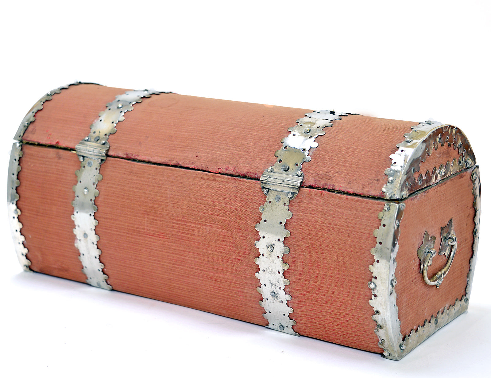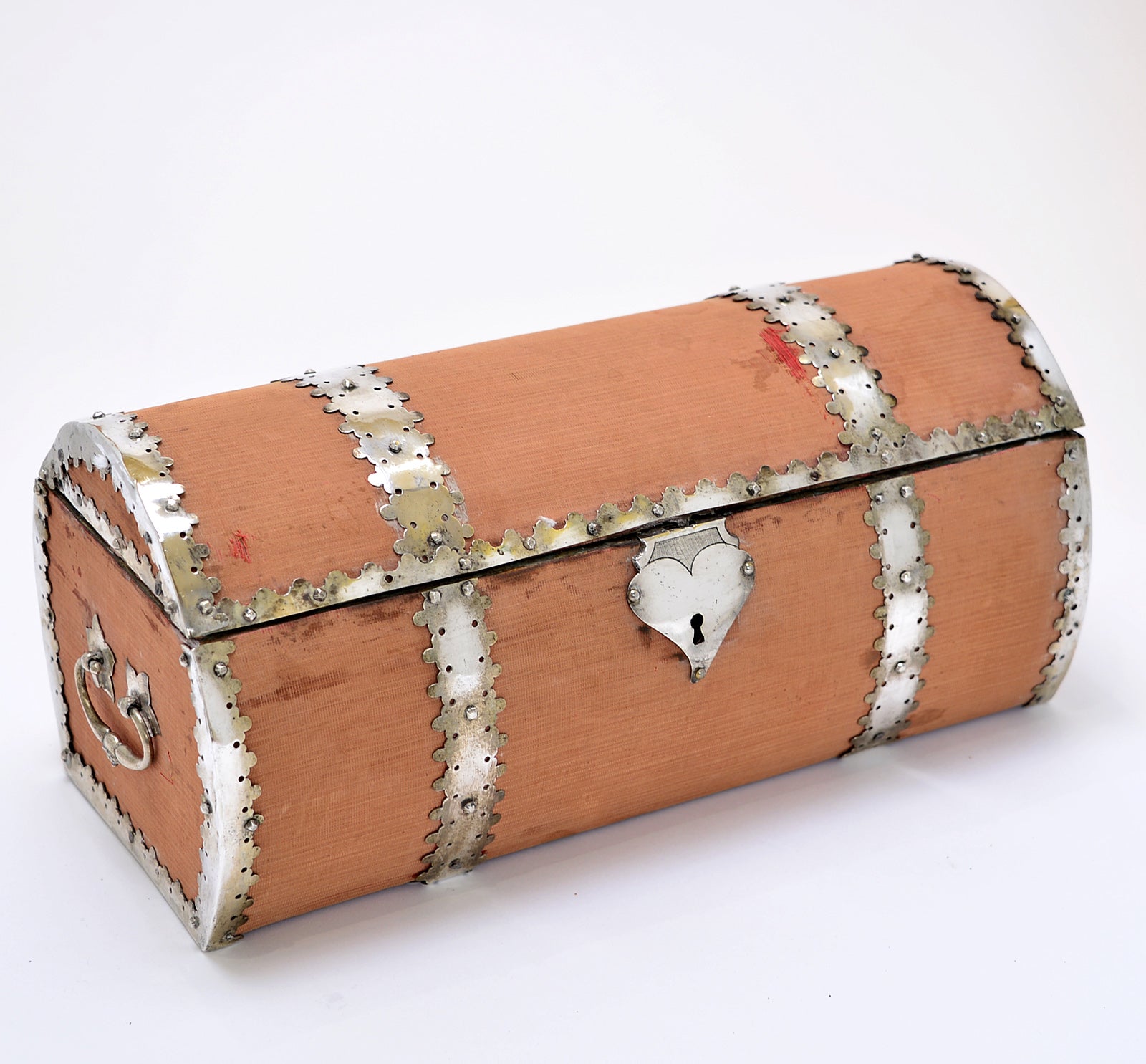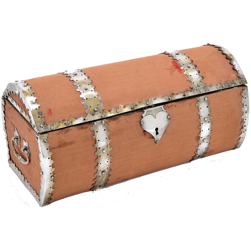 Late 18th / early 19th century Spanish colonial domed and lidded 'cofrecito' with silver hinges, handles, corner brackets and heart shaped lock-plate. Interior with metallic threaded selvages and silk lined fabric.