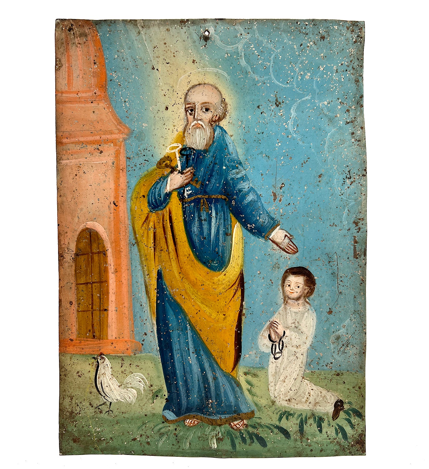 This rare 19th century Mexican folk retablo represents 'La Sombra de San Pedro' (The Shadow of Saint Peter). San Pedro, the patron saint of long life, is flanked by another figure, his shadow, which healed the sick when it was cast upon them as he passed by. The barrel keys are a reference to his role as the doorkeeper to the gates of heaven.