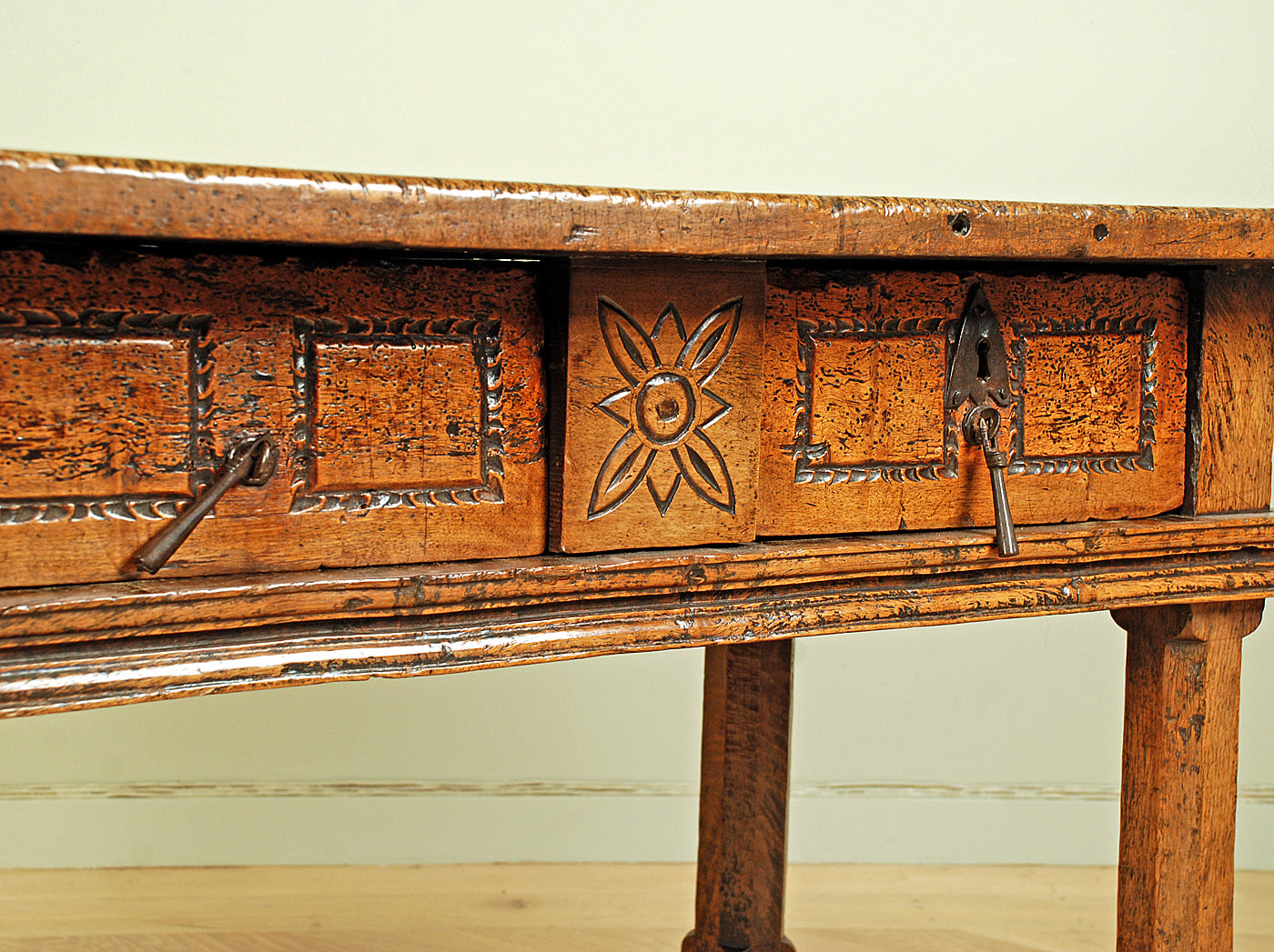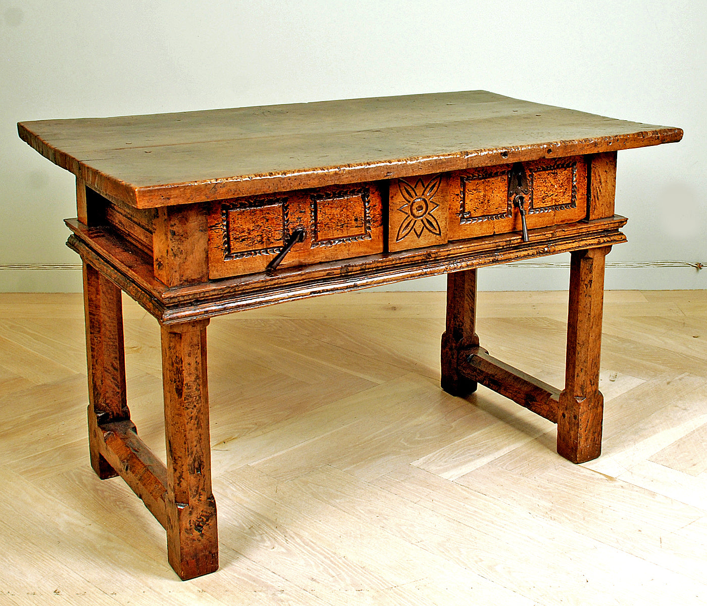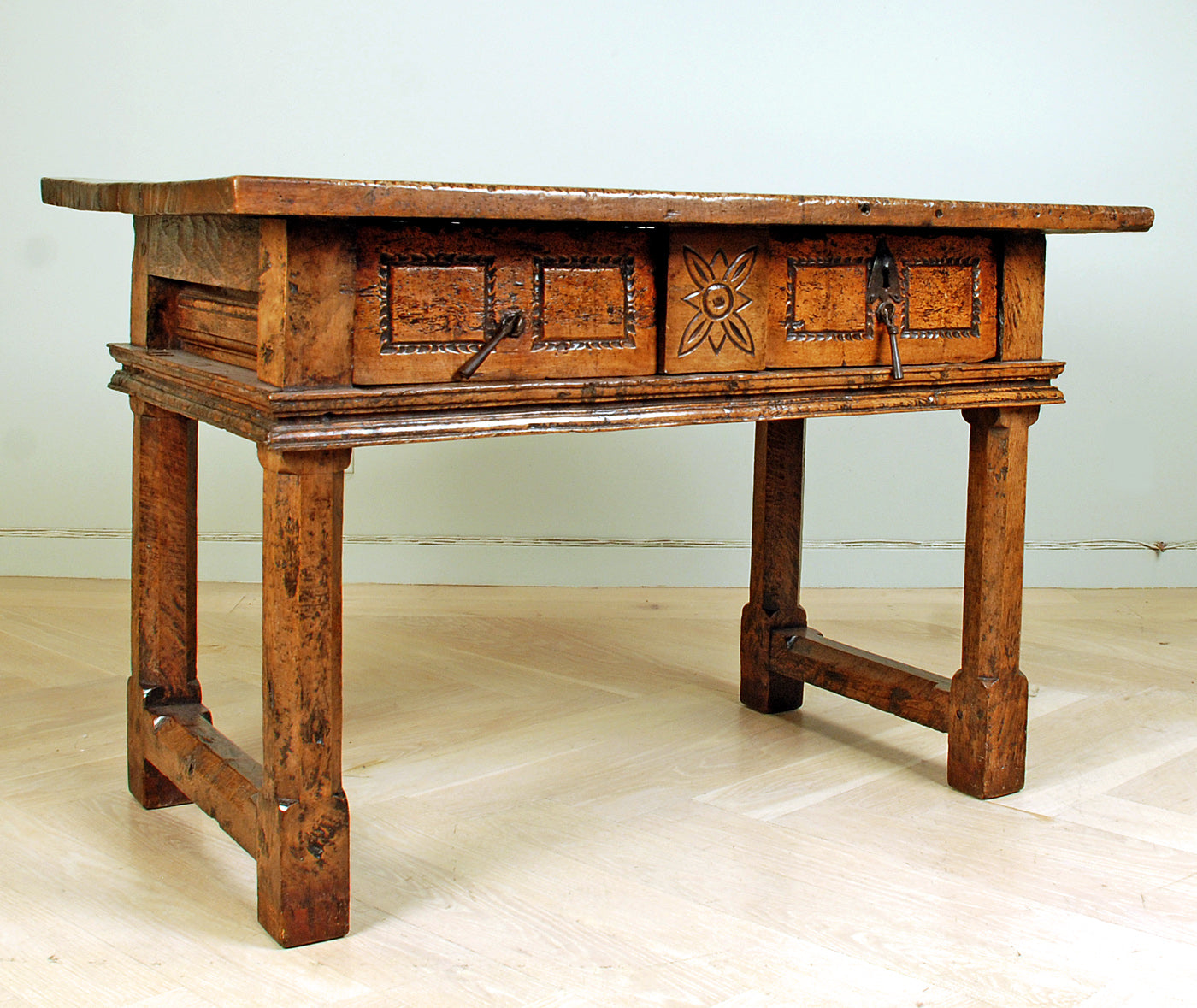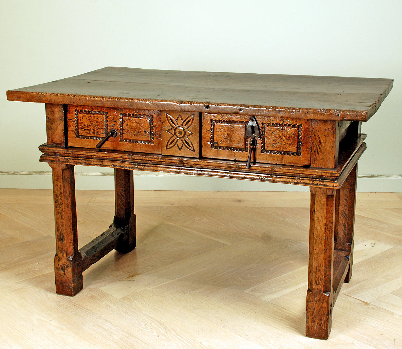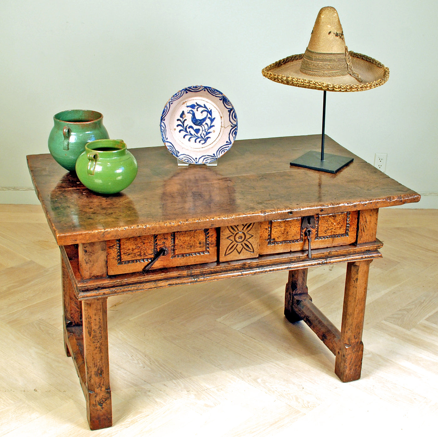 Exceptional mid to late 17th century Spanish Baroque period walnut table with a thick rectangular top over two heavily carved drawers and conforming panel. Hexagonal legs connected by a hexagonal stretcher base. Circa 1650 - 1700.