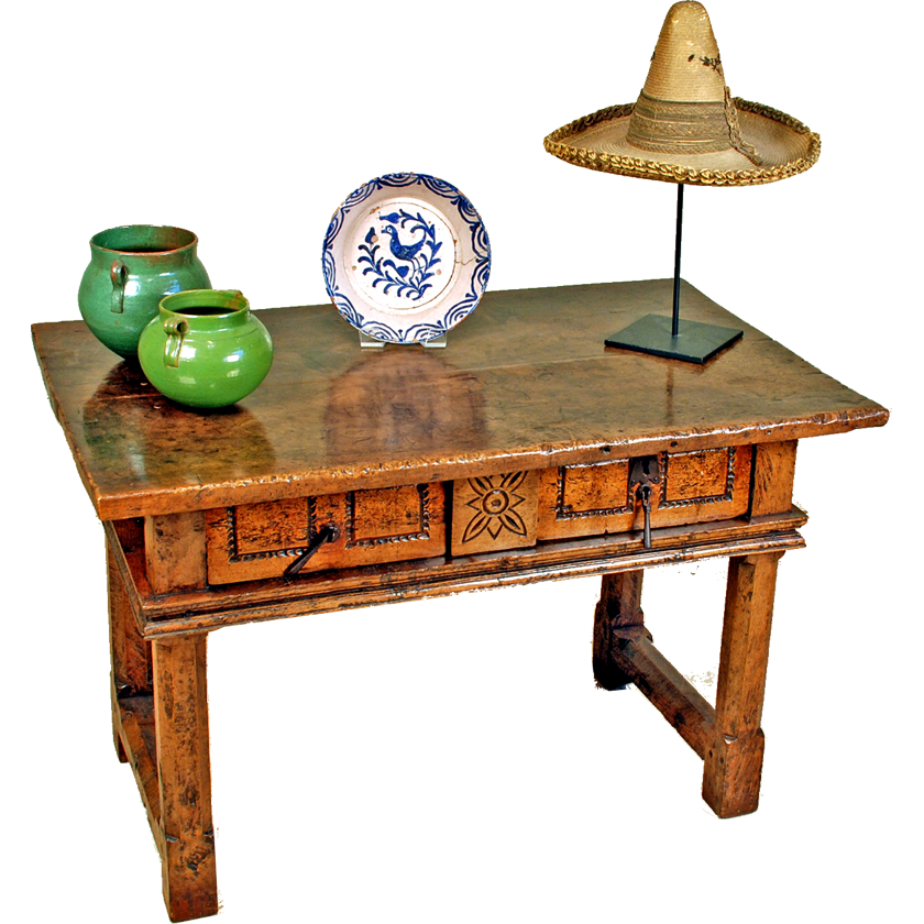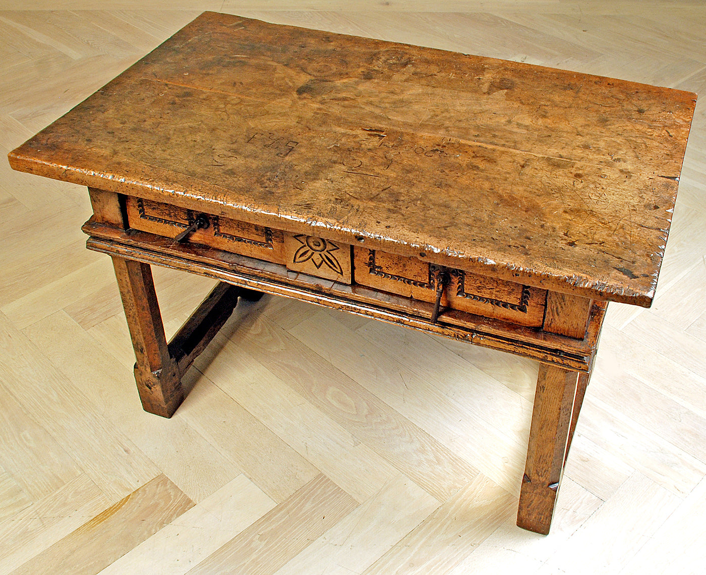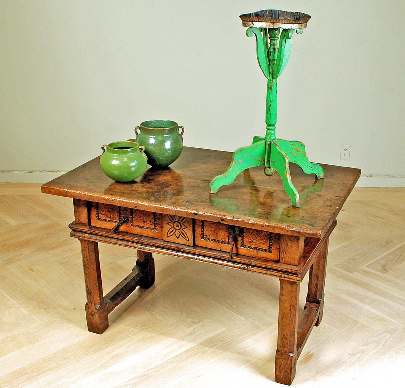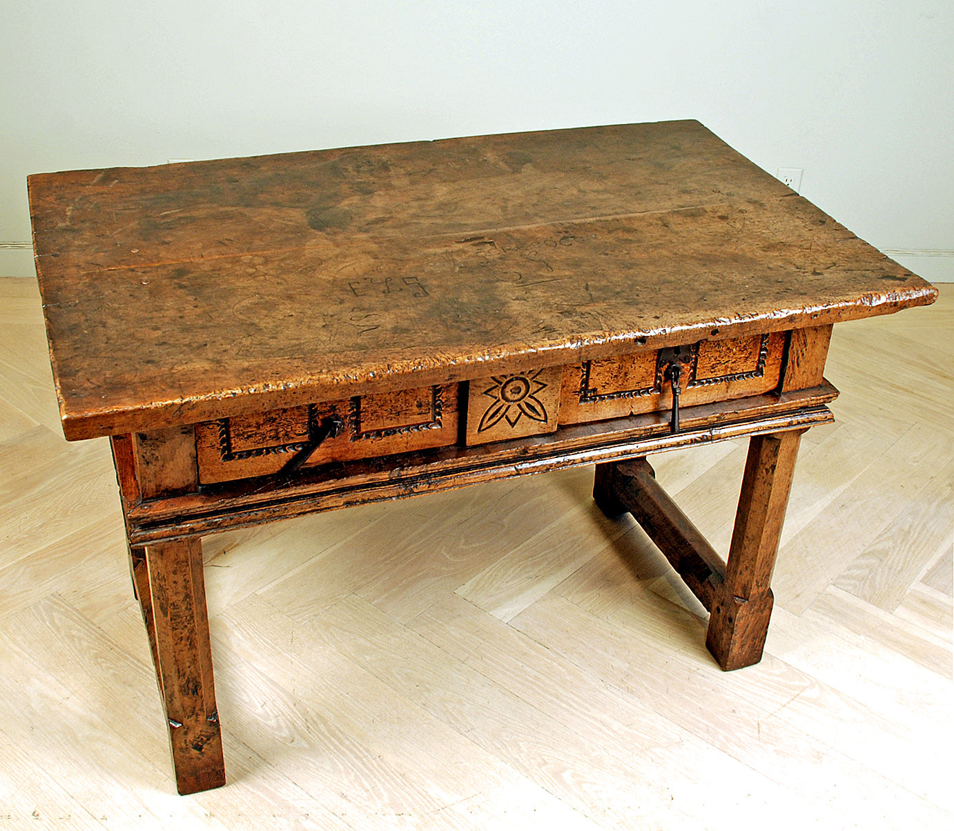 Exceptional mid to late 17th century Spanish Baroque period walnut table with a thick rectangular top over two heavily carved drawers and conforming panel. Hexagonal legs connected by a hexagonal stretcher base. Circa 1650 - 1700.