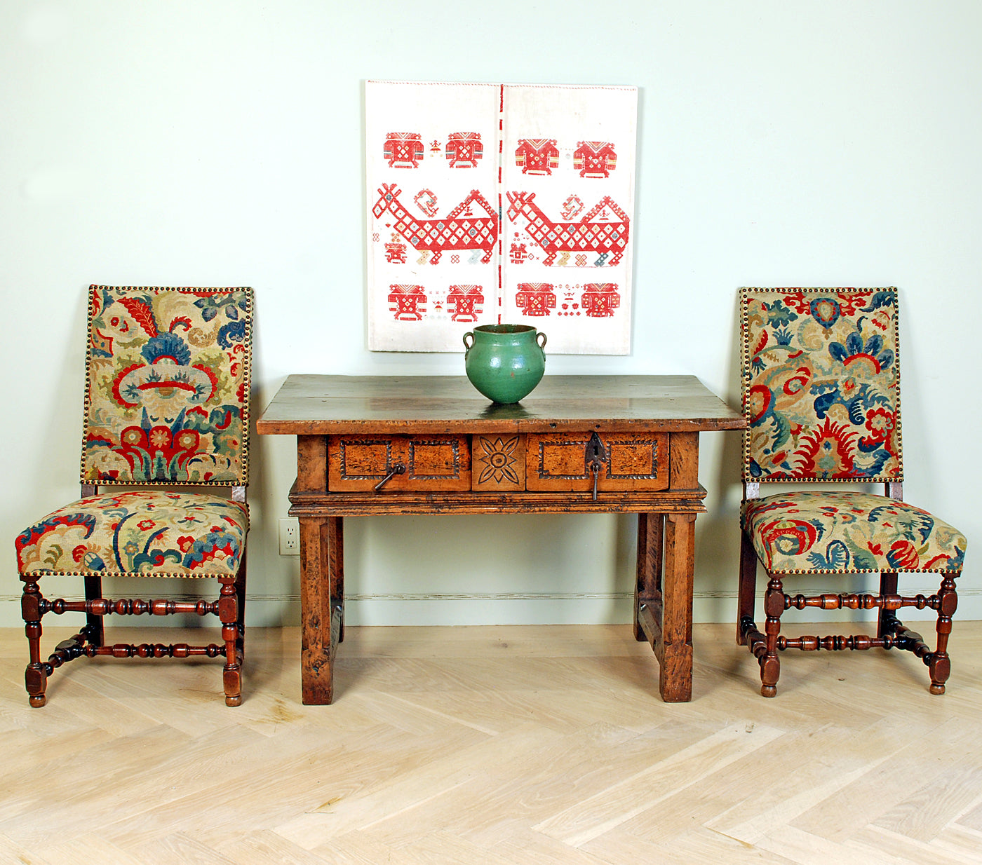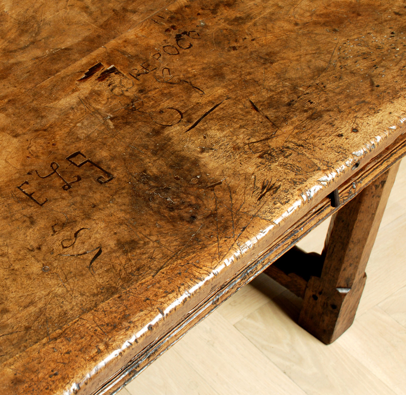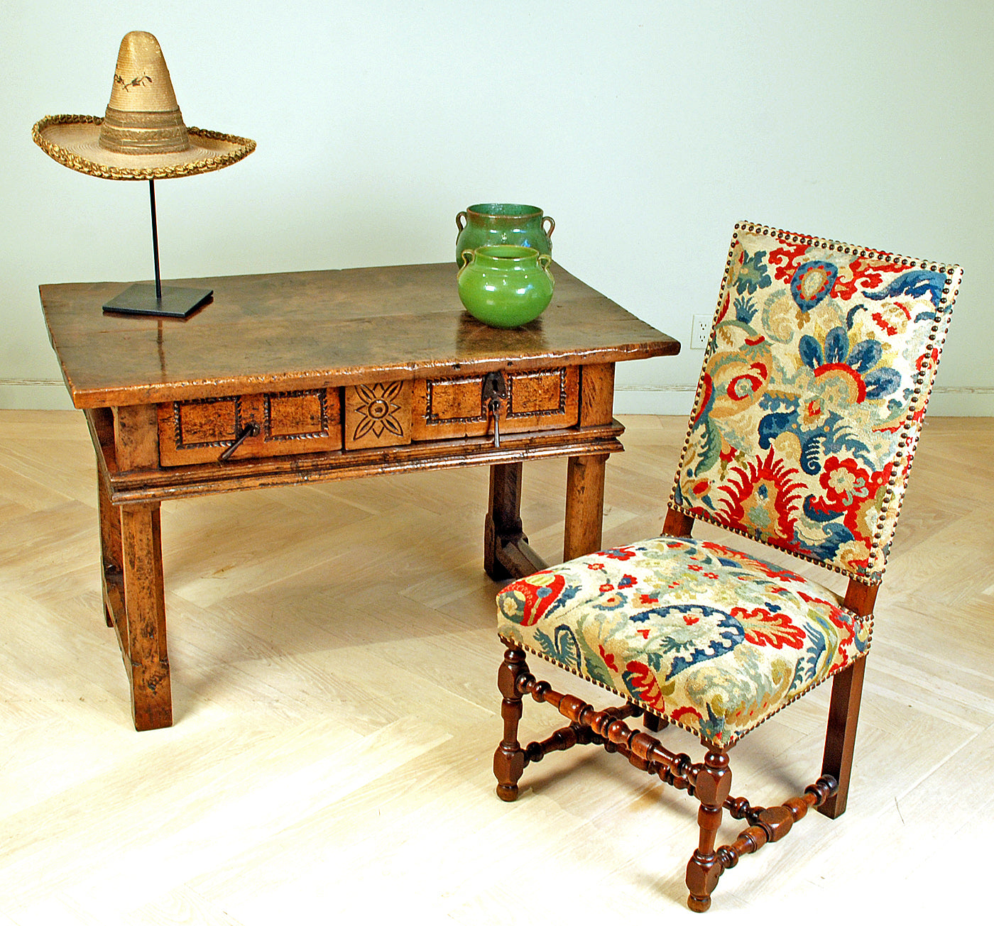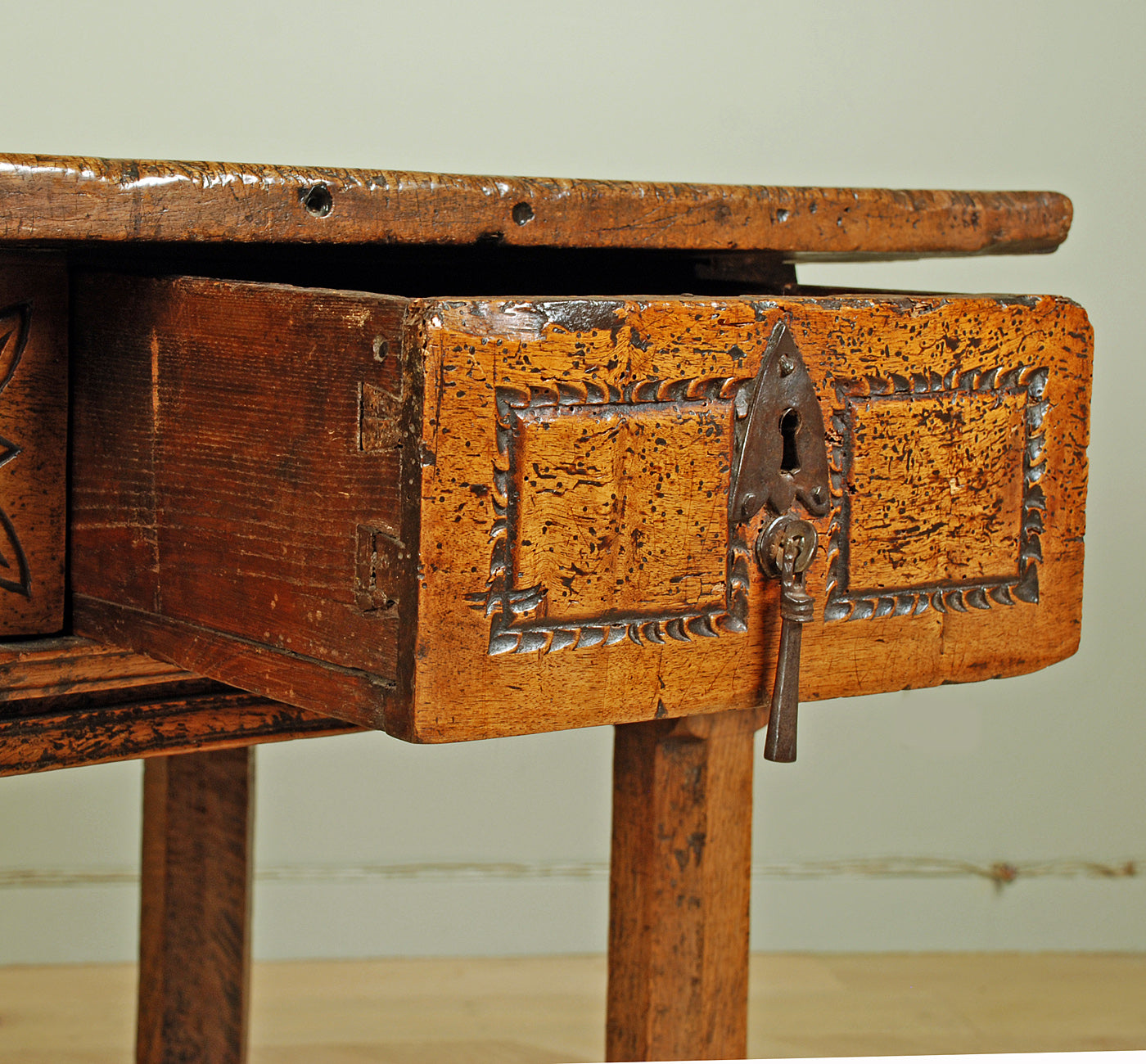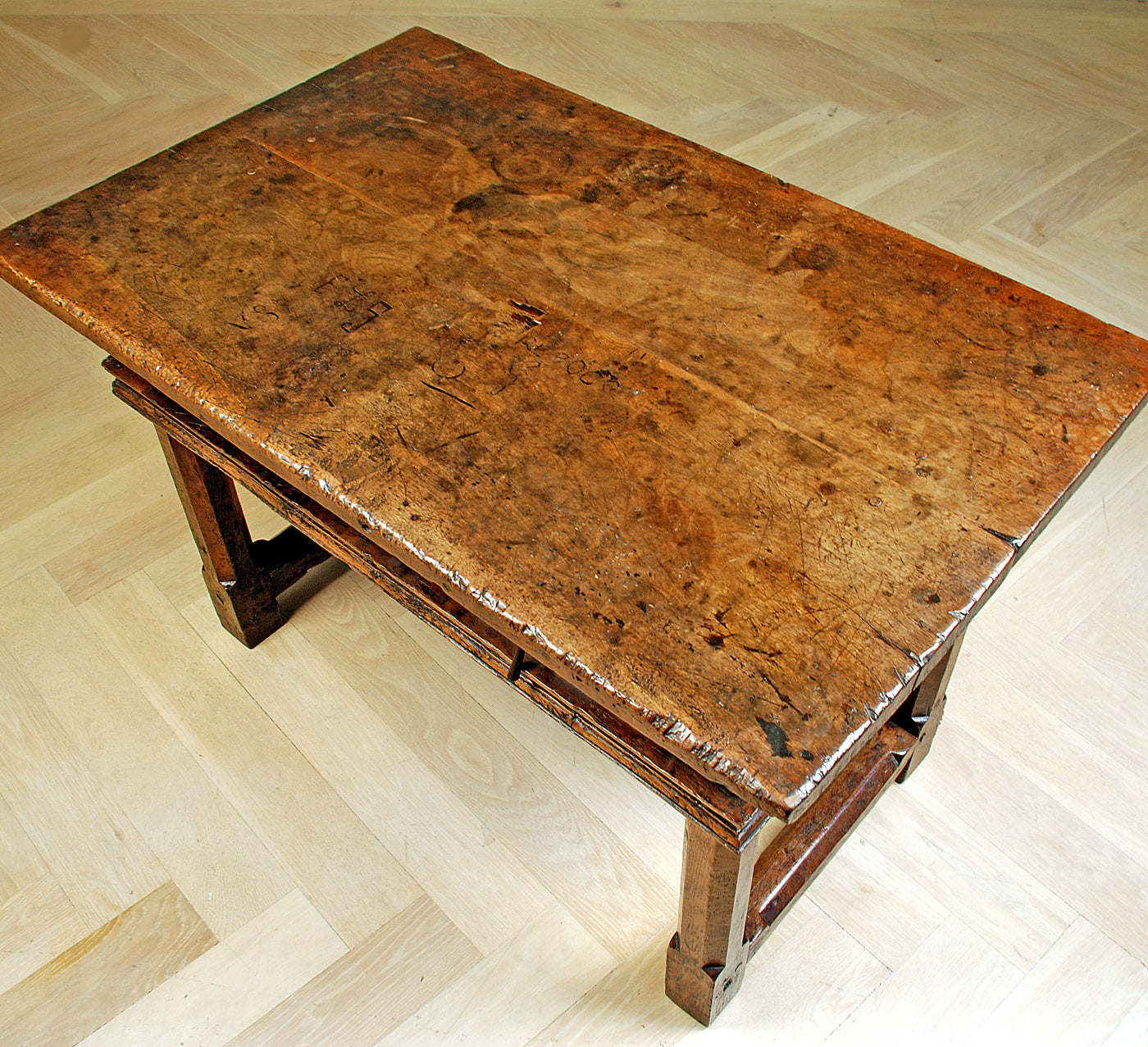 Exceptional mid to late 17th century Spanish Baroque period walnut table with a thick rectangular top over two heavily carved drawers and conforming panel. Hexagonal legs connected by a hexagonal stretcher base. Circa 1650 - 1700.