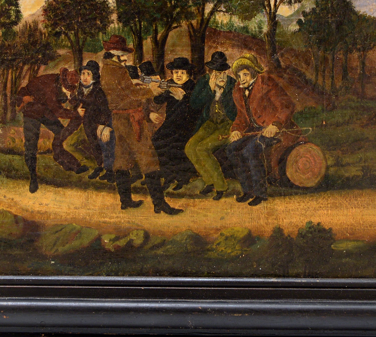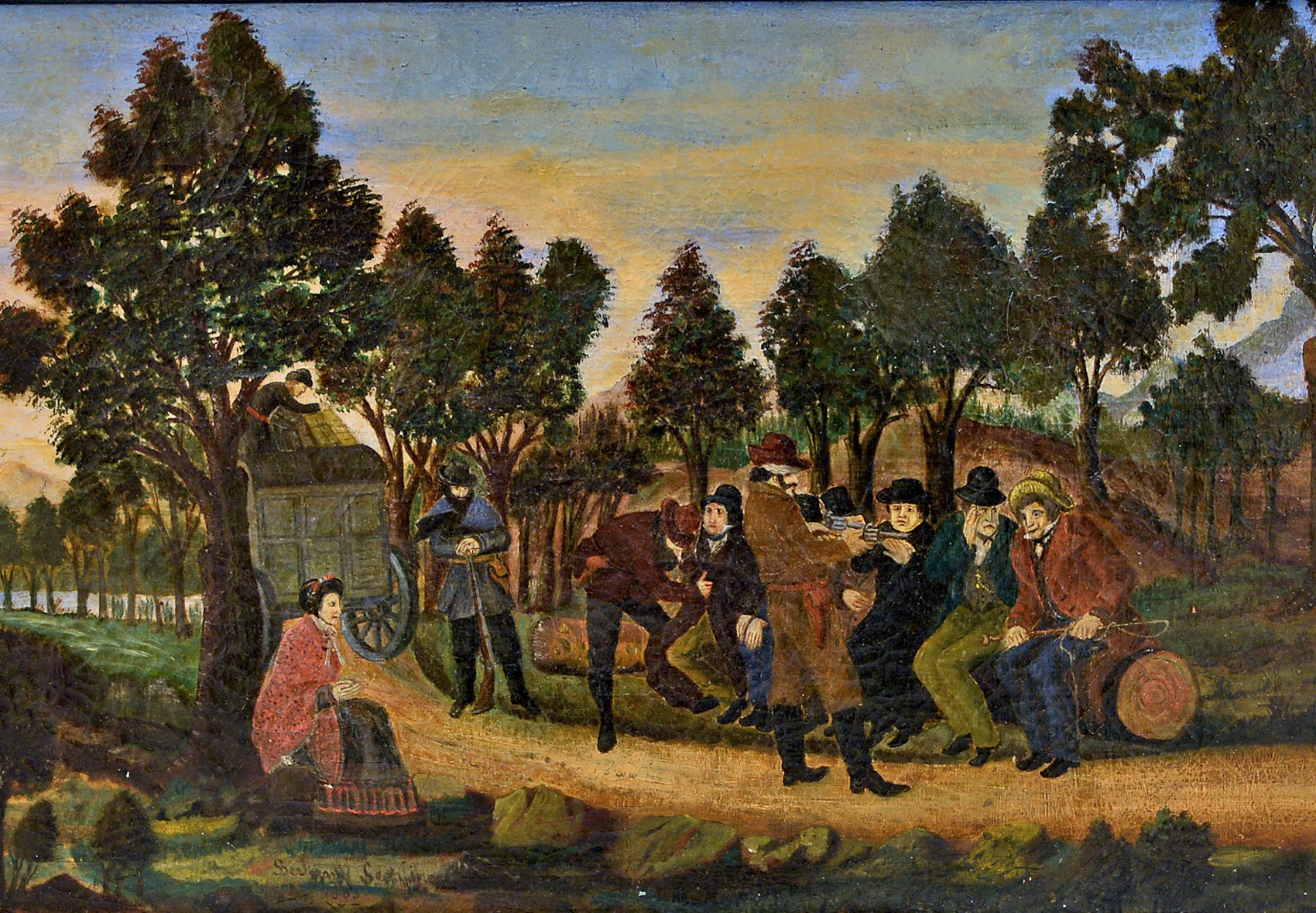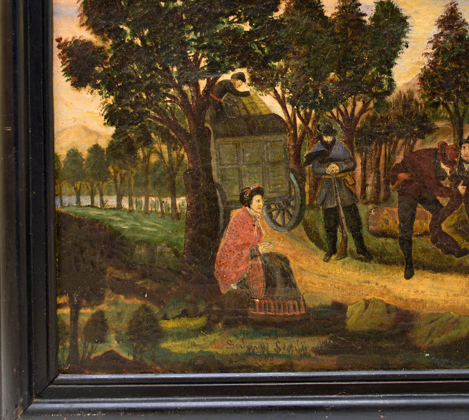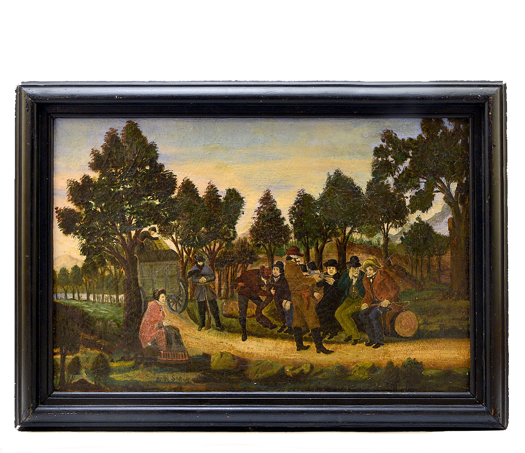 One of a kind 19th-century American oil on canvas painting depicting a stagecoach robbery. Signed lower right, Berliari (?) Serafine, and dated 1883.