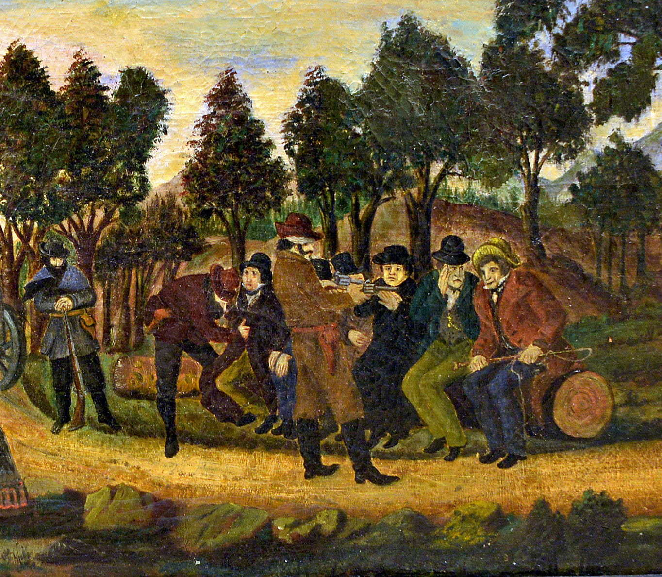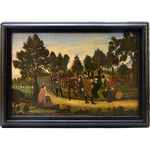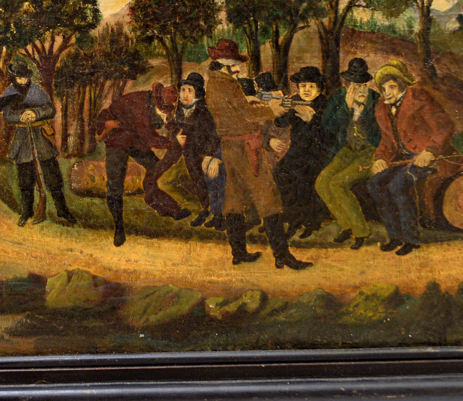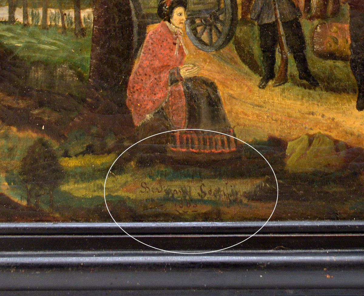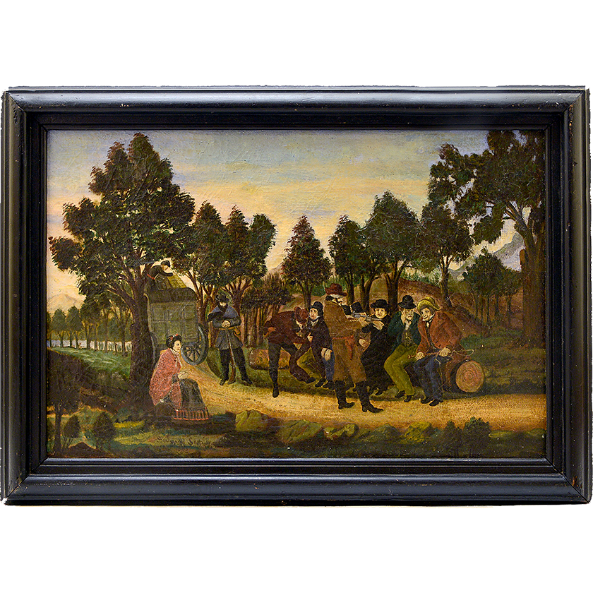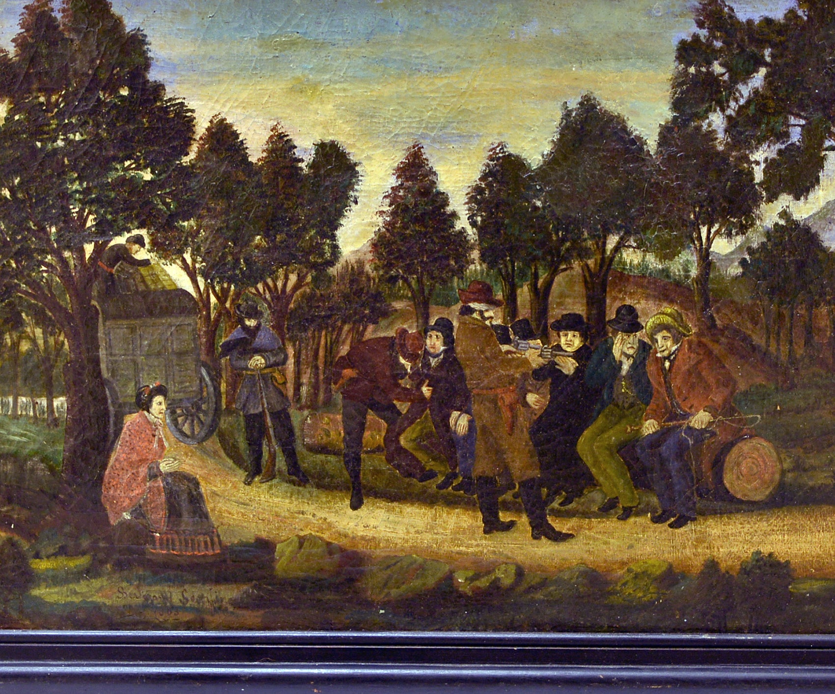 One of a kind 19th-century American oil on canvas painting depicting a stagecoach robbery. Signed lower right, Berliari (?) Serafine, and dated 1883.