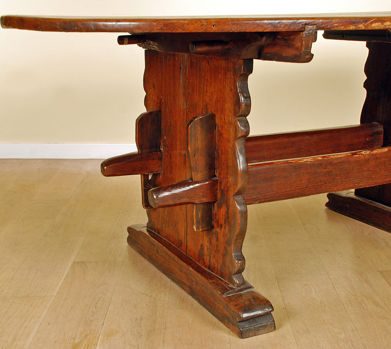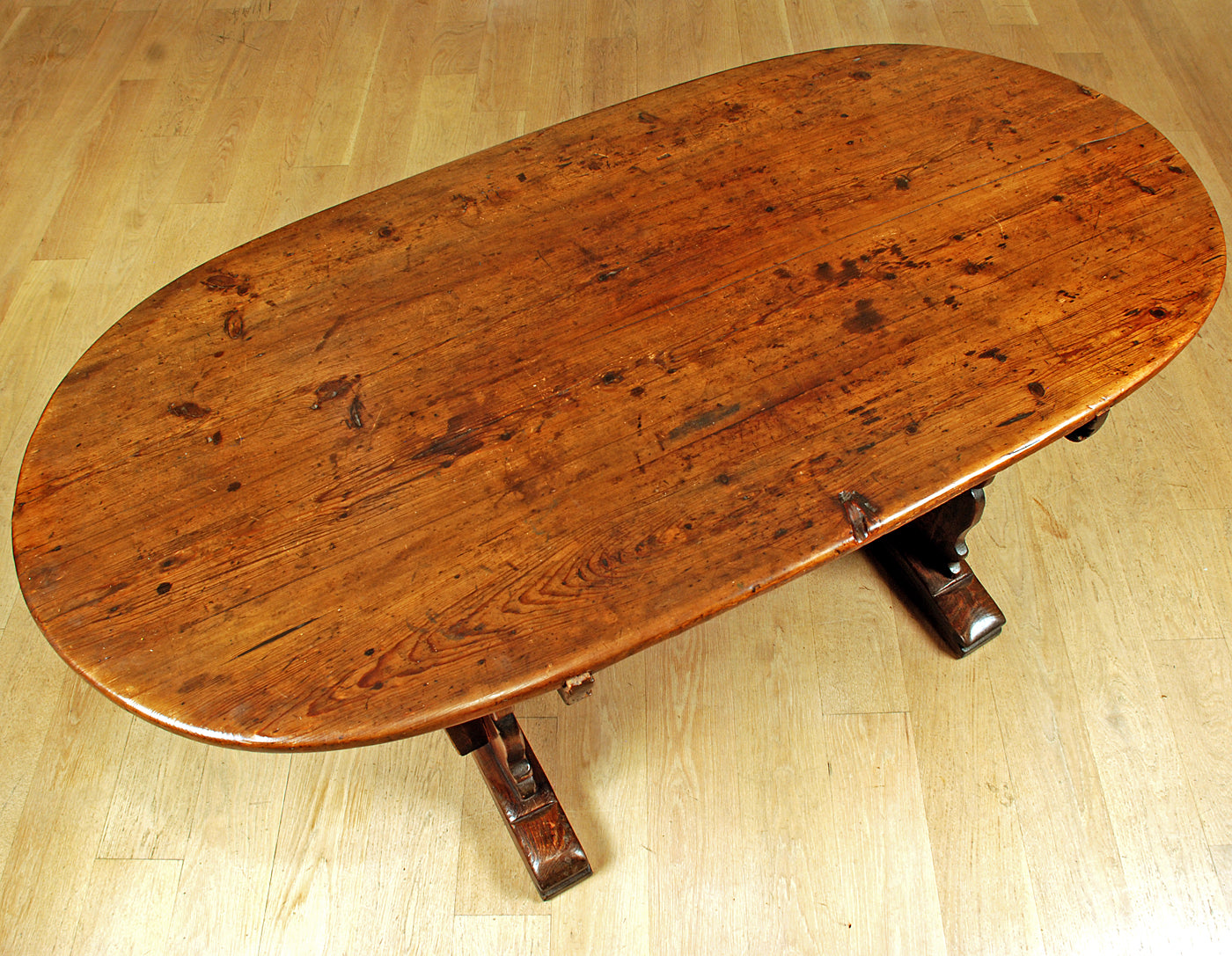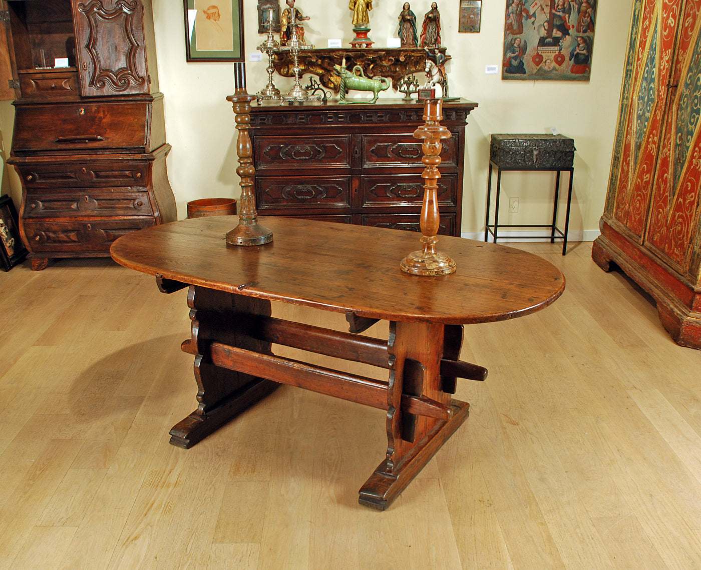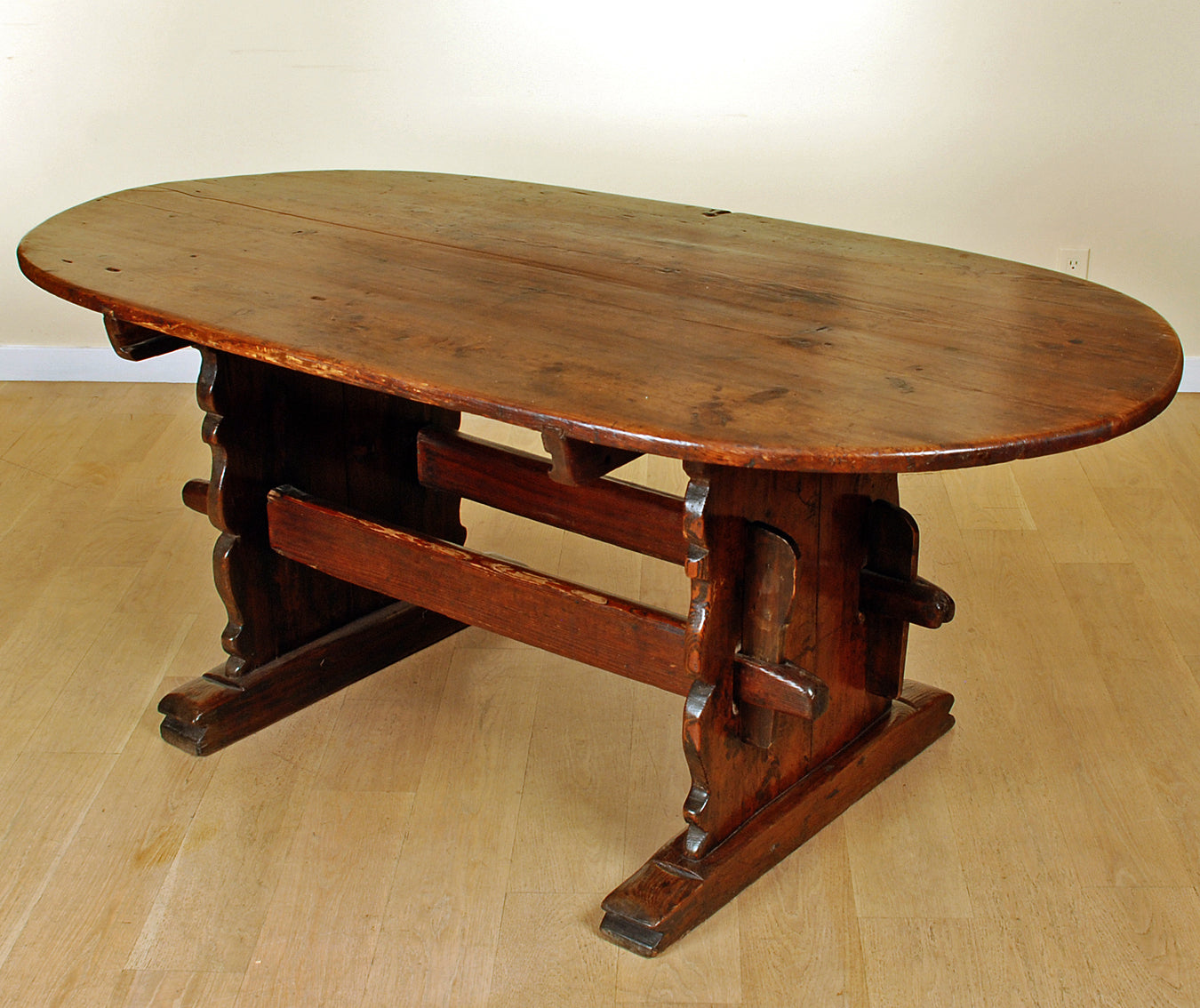 A rare 18th century Alpine Baroque period center table with an oval top raised on scalloped legs and shoe feet. The supports connected by thru stretchers secured by tenons.