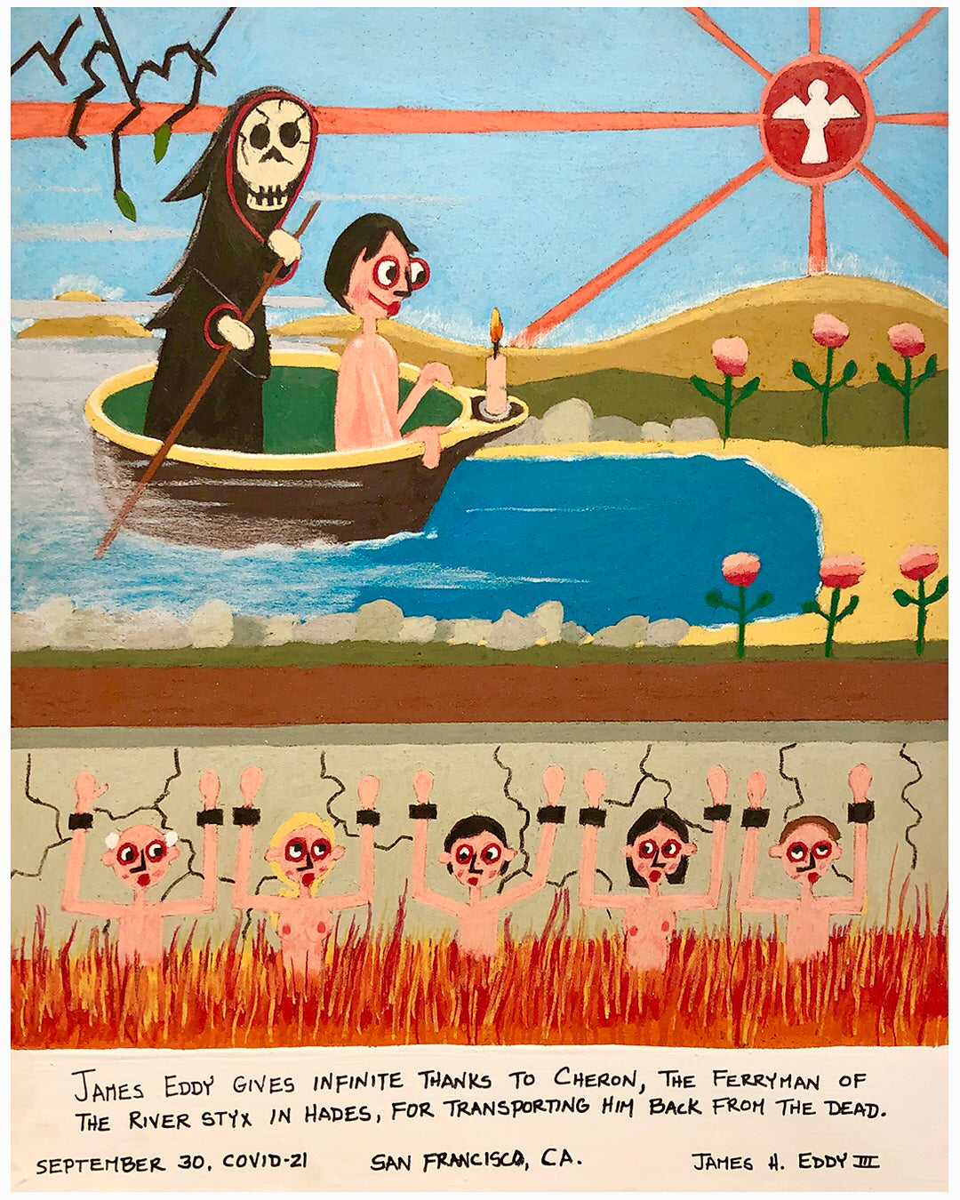 Caption: “James Eddy gives infinite thanks to Cheron, the ferrymen of the River Styx in Hades, for transporting him back from the dead”. September 2021.