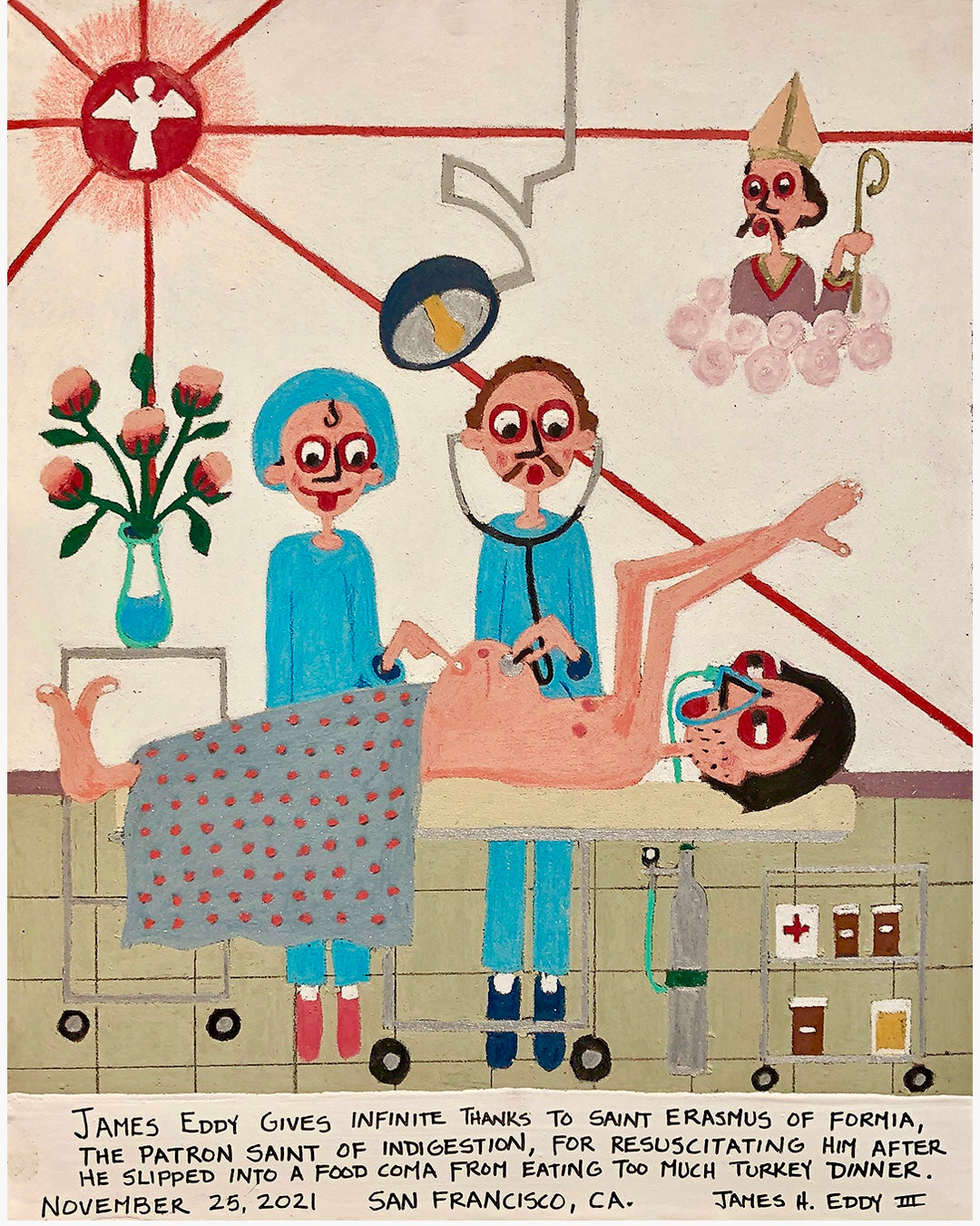 Giving thanks. “James Eddy gives infinite thanks to Saint Erasmus of Formia, the patron saint of indigestion, for resuscitating him after he slipped into a food coma from eating too much turkey dinner.”
