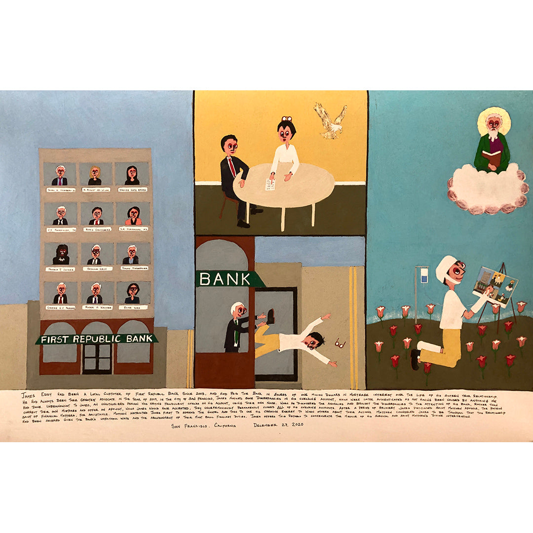James Eddy had been a loyal customer of First Republic Bank since 2003, and had paid the bank in excess of one million dollars in mortgage interest over the course of his 16 year relationship. He had always been their greatest advocate. In the year of 2019, in the City of San Francisco James noticed some discrepancies in his checking account, which were later authenticated as not having been caused by anything he had done. Unbeknownst to James, an unauthorized person was writing fraudulent checks on his account, using their own name. When he discovered the anomalies and brought the discrepancies to the attention of his bank, rather than correct their own mistakes and offer an apology, which James would have accepted, they unceremoniously permanently closed ALL of his checking accounts. After a period of recovery, James petitioned Saint Matthew Apostle, the patron saint of financial matters, for assistance. Matthew instructed James first to spread the gospel and then to use his creative energy to warn others about their actions. Matthew counseled James to be thankful that this relationship had been severed given the bank's unfaithful ways and the abandonment of their most basic fiduciary duties. James offers this retablo to commemorate the miracle of his survival and Saint Matthew's divine intervention. December 27, 2020. San Francisco, CA.”