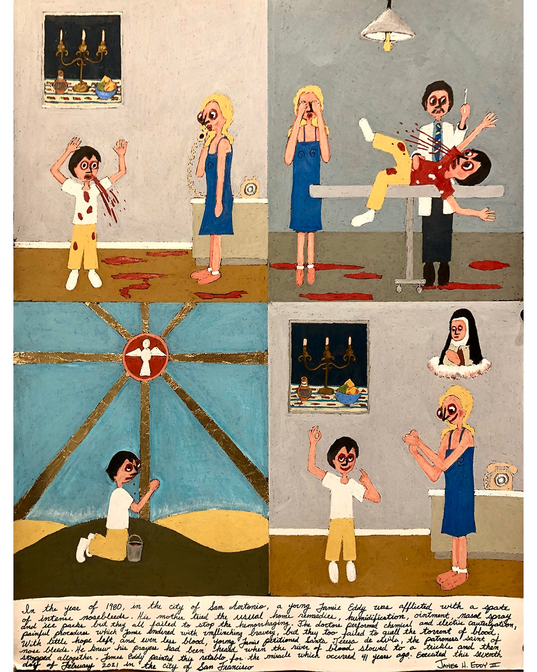 “In the year of 1980, in the city of San Antonio, a young Jamie Eddy was afflicted with a spate of intense nosebleeds. His mother tried the usual home remedies, humidification, ointment, nasal spray and ice packs but they all failed to stop the hemorrhaging. The doctors performed chemical and electrical cauterization, painful procedures which Jamie endured with unflinching bravery, but they too failed to quell the torrent of blood. With little hope left, and even less blood, young Jamie petitioned Santa Teresa de Avila, the patroness saint of nose bleeds. He knew his prayers had been heard when the river of blood slowed to a trickle and then stopped altogether. James Eddy painted this retablo to commemorate the miracle which occurred 41 years ago. Executed this seventh day of February 2021 in the City of San Francisco.”
