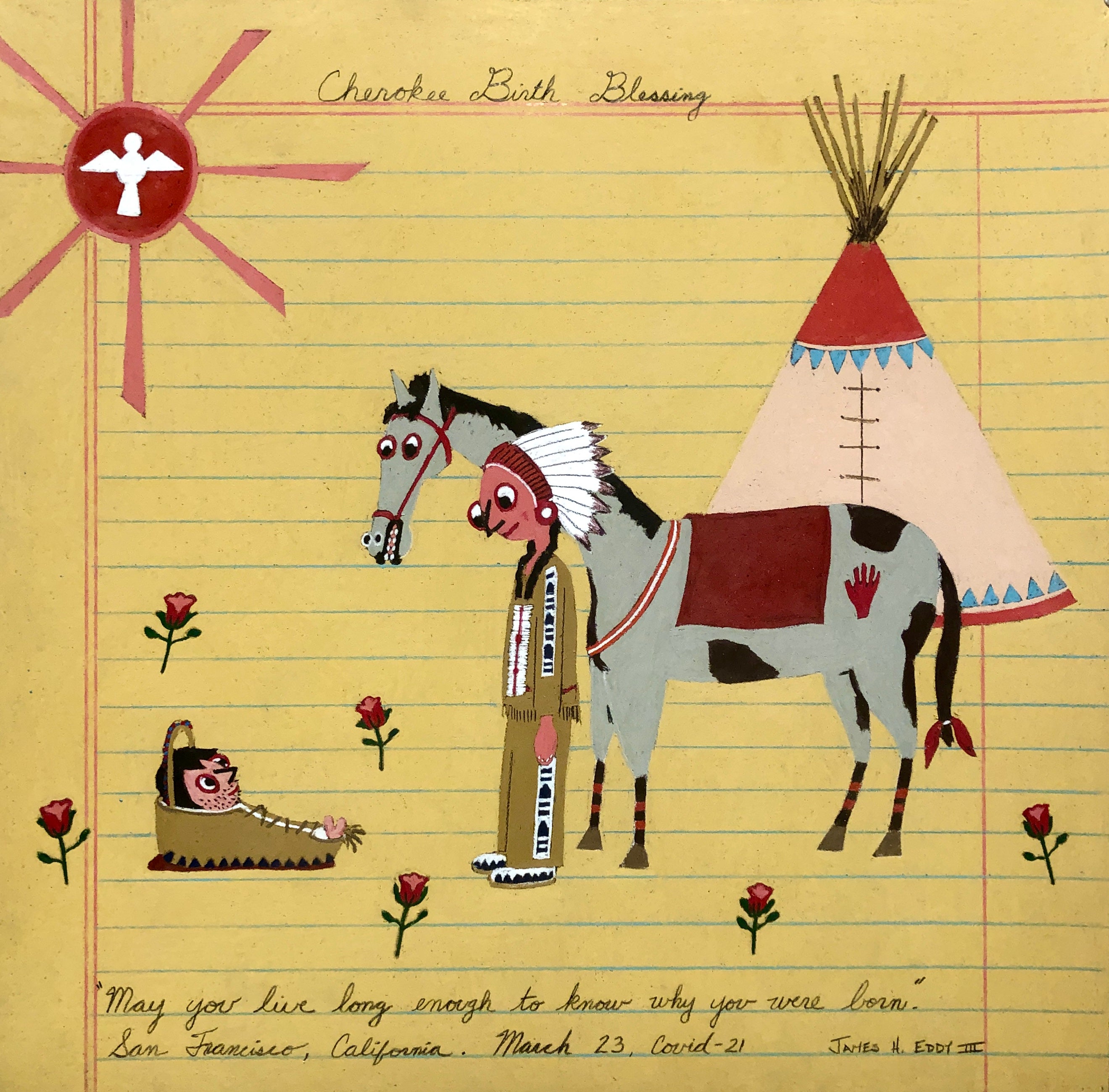 A Cherokee birth blessing rendered in the style of an American Indian ledger drawing.