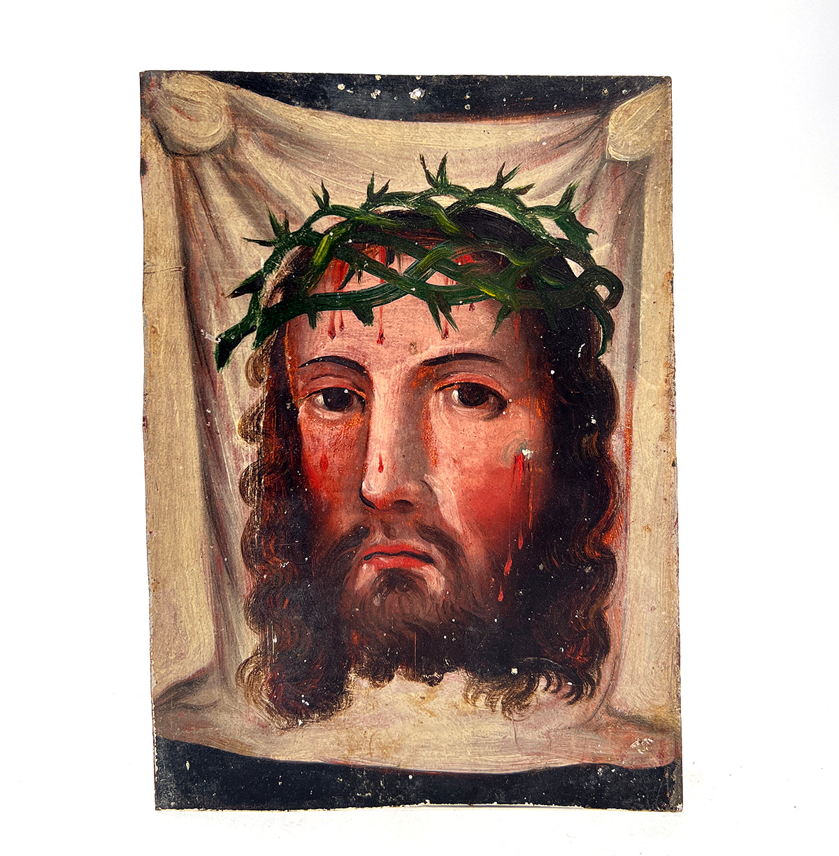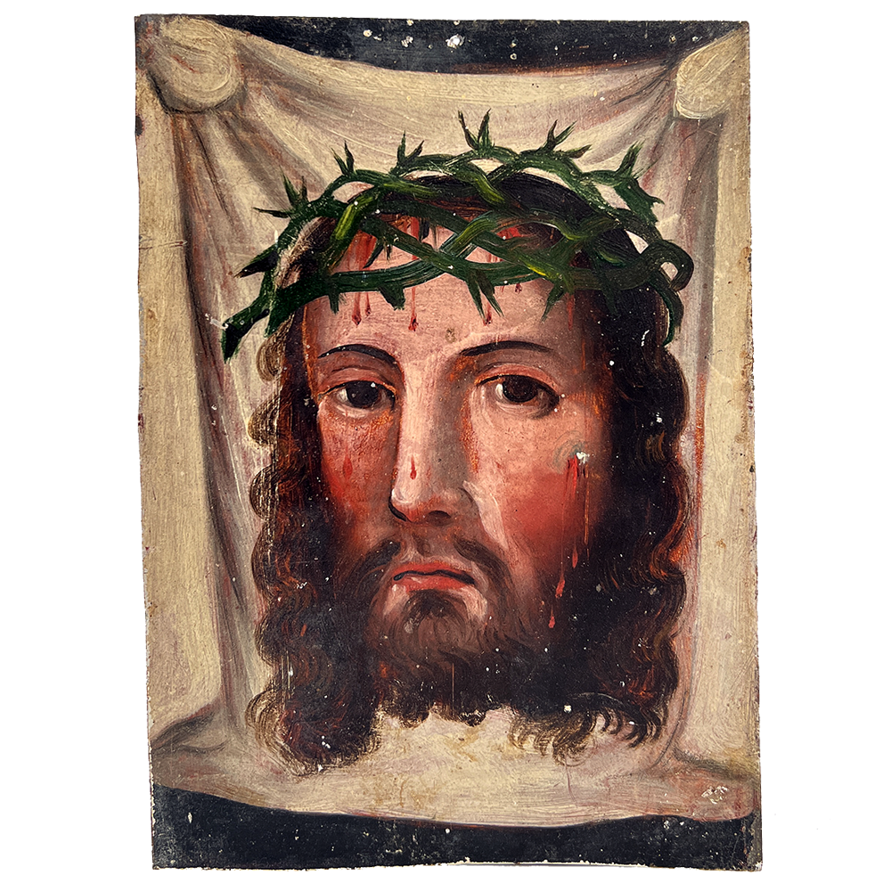 This 19th century Mexican folk retablo represents "Veronica's Veil." According to popular legend, Veronica, a woman who made her way through the crowds when she saw Christ on the way to Calvary, wiped the sweat and the blood from his forehead. His image is said to have imprinted itself and is still preserved in Saint Peter's today. Arguably, the title of this theme is also derived from "Vera Icon" or "True Icon.