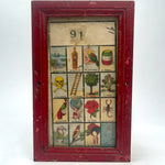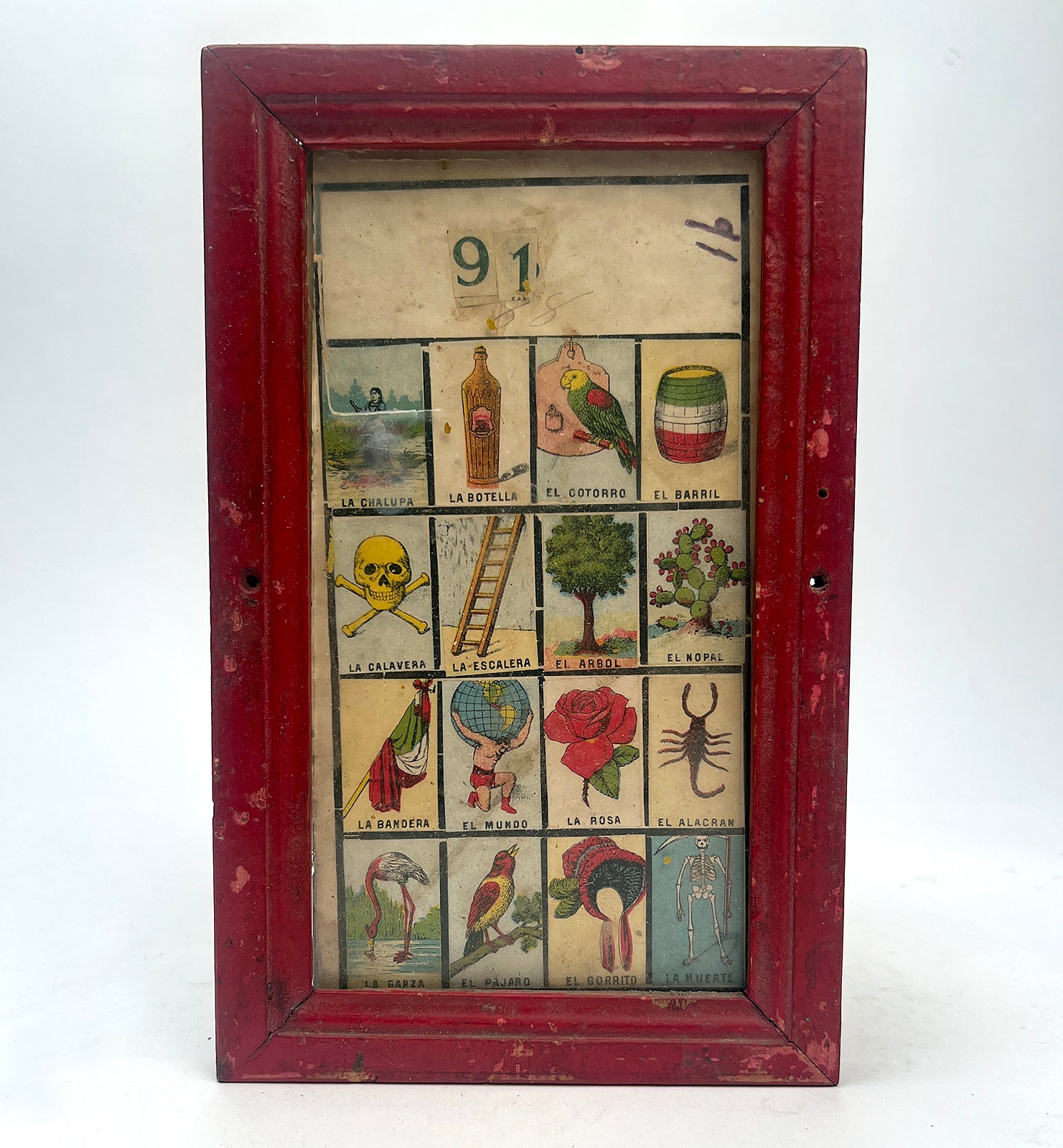 A vintage 'loteria' card from Mexico, circa 1960's. Displayed in a period wood frame