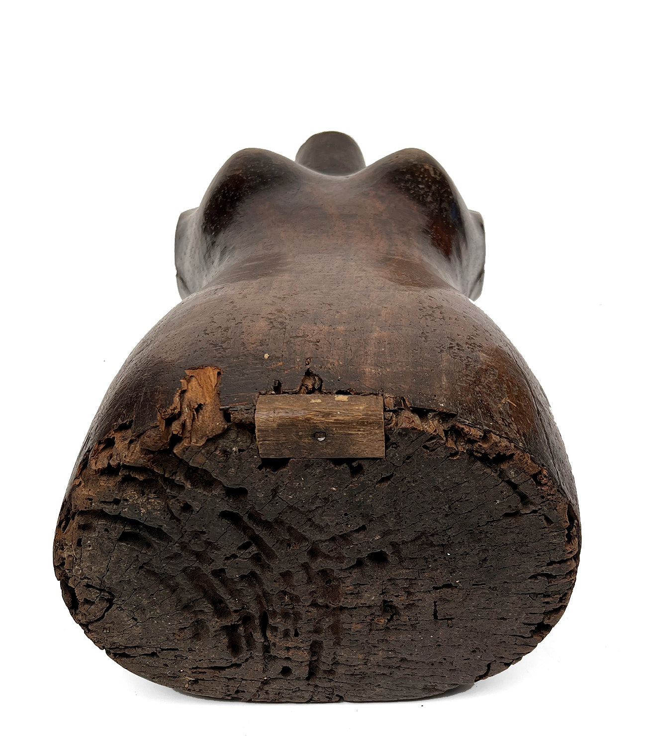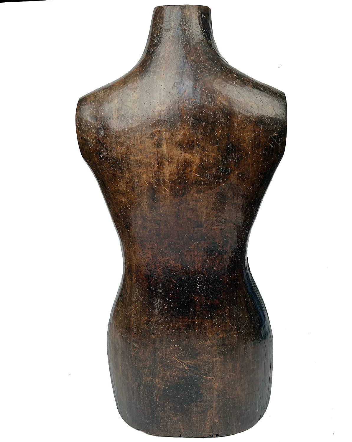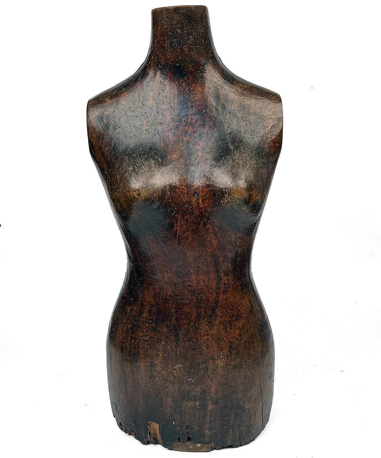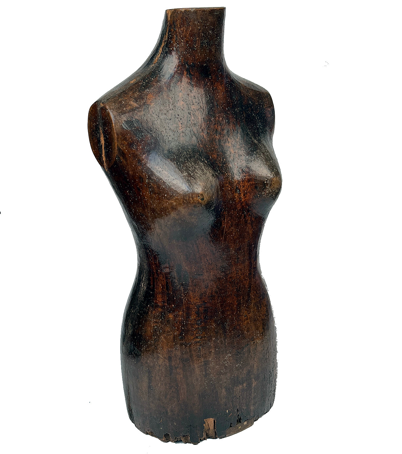 Early 20th century hand carved and hand adzed wood dress form in the shape of the female torso. Solid black walnut with lustrous patina throughout.